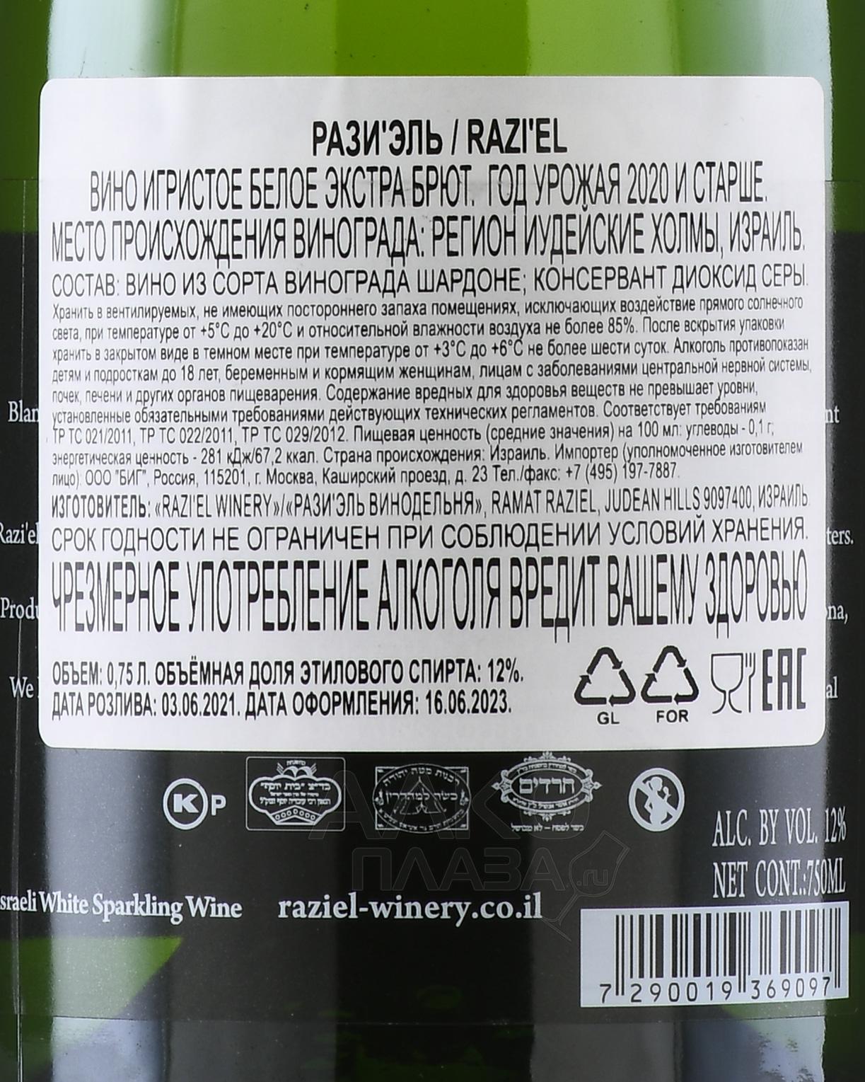 Игристое вино Razi`el Extra Brut 0,75 л создано в классическом стиле брют с минимальным содержанием сахара и подчёркнутой минеральностью. Виноград выращен на каменистых склонах, где сухой климат и перепады температур способствуют формированию концентрированных ароматов и высокой кислотности ягод. Урожайный год отличался стабильной погодой, что обеспечило виноделам качественное сырьё с выраженным сортовым характером. Ягоды собирали вручную и тщательно сортировали. Первичная ферментация проходила в 600-литровых французских дубовых бочках, где формировались структура и ароматика. Далее базовое вино выдерживалось на осадке 6 месяцев, после чего проводилось вторичное брожение в бутылке по методу шампенуаз. Выдержка на осадке длилась 2 года, что придаёт брюту кремовую текстуру и глубокий вкус.