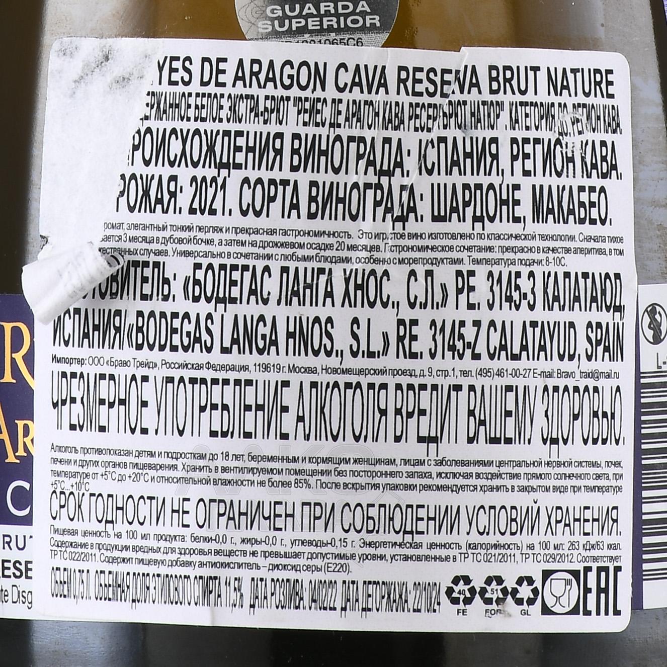 Игристое вино Reyes de Aragon Cava Reserva 0,75 л создано в Арагоне, где виноградники расположены на высоте и получают много солнечного света при прохладных ночах. Такой климат позволяет ягодам сохранять свежесть и кислотность. Вино произведено по традиционному методу с вторичной ферментацией в бутылке. После первичной ферментации базовое вино выдерживалось 3 месяца в дубовой бочке. После вторичной ферментации белый брют натур (без дозажа) созревал на тонком осадке 20 месяцев, что обеспечило ему глубину и кремовую текстуру. Кава отмечена высокими оценками экспертов и включена в рейтинги лучших испанских игристых вин благодаря стабильному качеству и изысканной структуре.