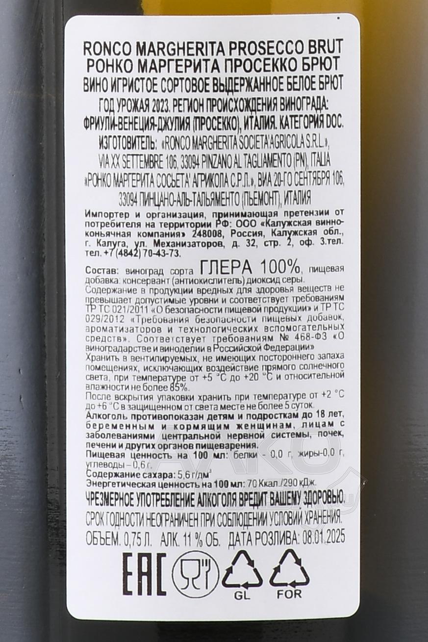 Игристое белое вино брют Ronco Margherita Prosecco Brut 0,75 л – лёгкий и яркий моносорт из винограда сорта Glera, выращенного в терруаре категории DOC в регионе Фриули–Венеция-Джулия, на холмах около Пинцано-аль-Таджлиаменто. Почвы этой зоны богаты глиной, что придало будущему напитку плотность и структуру. Сбор проводился чуть раньше полной зрелости, чтобы сохранить свежесть. После мягкого прессования и первичной ферментации последовал этап вторичного брожения по методу Charmat‑Martinotti в стальных резервуарах, продолжавшийся около 2 месяцев.