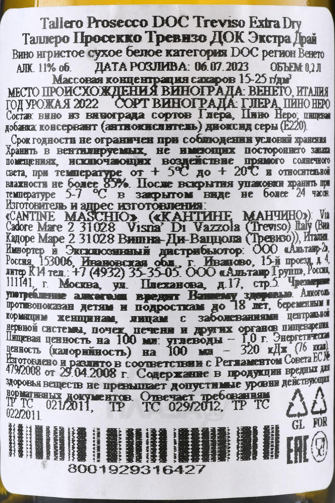 Игристое белое экстра драй вино Tallero Prosecco DOC Extra Dry 0,2 л производится в регионе Венето на северо-востоке Италии. Виноградники расположены на холмах вокруг города Тревизо, на высоте 100–300 метров над уровнем моря. Почвы здесь – в основном глинистые с примесью известняка. Это обеспечивает хороший дренаж и влияет на свежесть и структуру вина. Климат – умеренно-континентальный, с жарким летом и прохладной зимой. Напиток сделали методом Шарма, при котором вторичная ферментация проходит в закрытых стальных резервуарах, что позволяет сохранить свежие ароматы и тонкую текстуру пузырьков. Маленький формат бутылки удобен для индивидуального употребления или пробной дегустации.