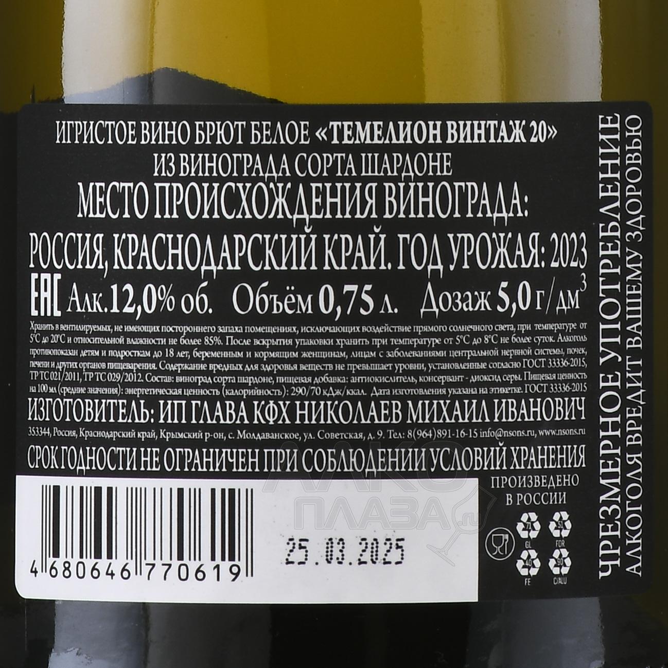 Temelion Vintage Brut - вино игристое Темелион Винтаж 20 брют белое 0.75 л 0.75 л