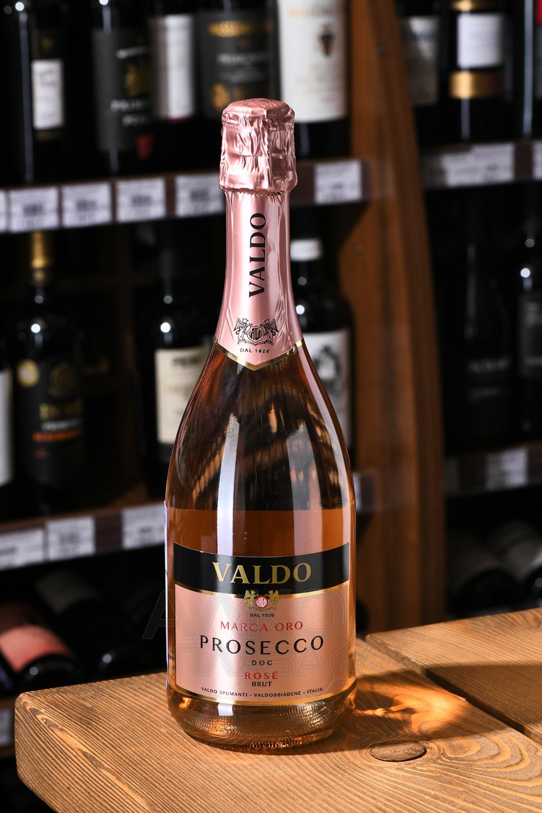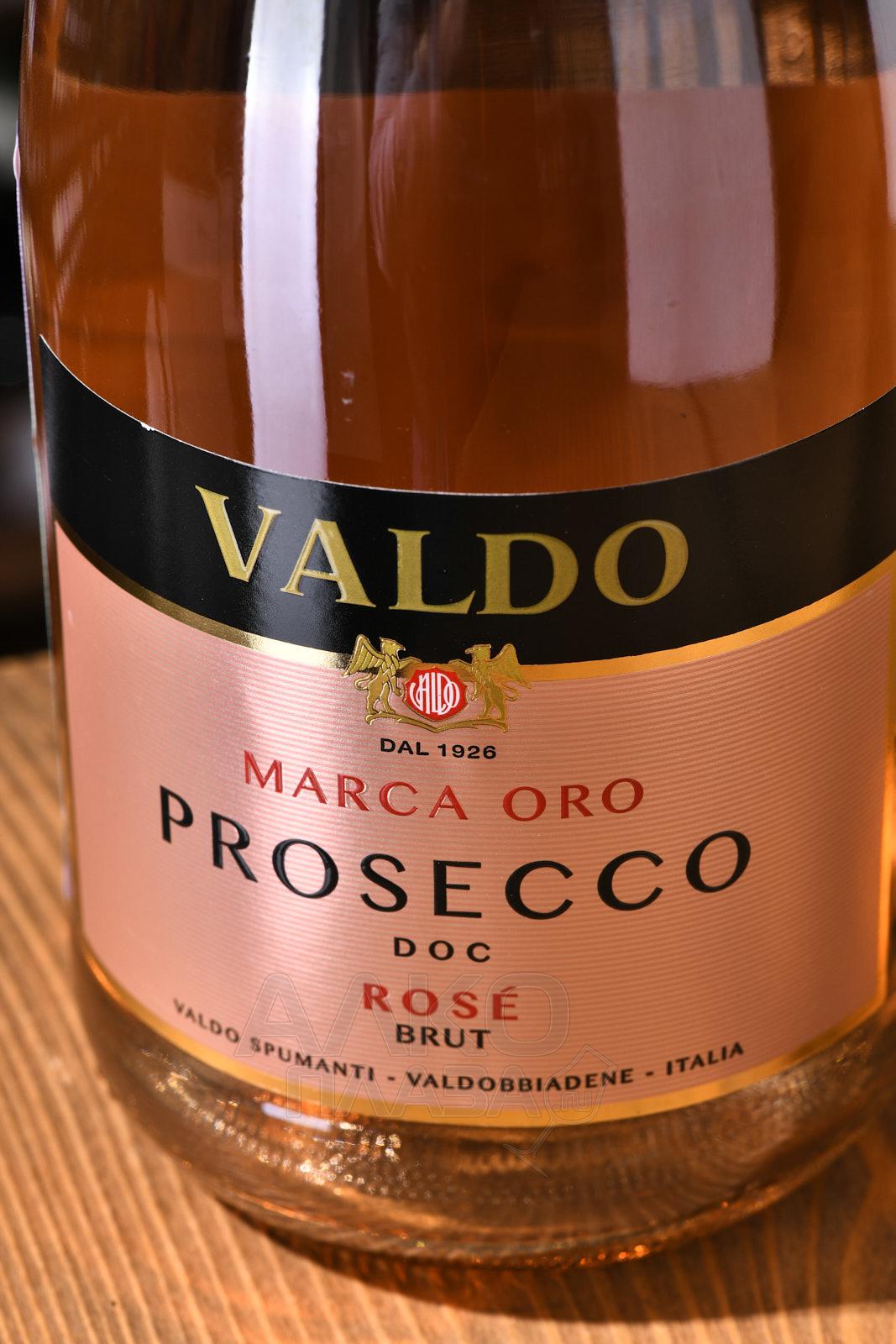 Игристое вино Valdo Marca Oro Prosecco Rose Brut DOC 2023 год 0,75 л — изысканный розовый брют из итальянской провинции Венето. Он изготовлен традиционным способом (метод Шарма-Мартинотти) из самого распространенного местного сорта Глера с добавлением небольшой доли Пино Нуара. Виноградники располагаются в специальной зоне Просекко ДОК на участках с известняково-глинистыми почвами в прохладном микроклимате. Сбор урожая осуществляется в начале сентября. Розовое просекко не менее 3 месяцев выдерживалось на тонком осадке. Потенциал в бутылке — 2-3 года.