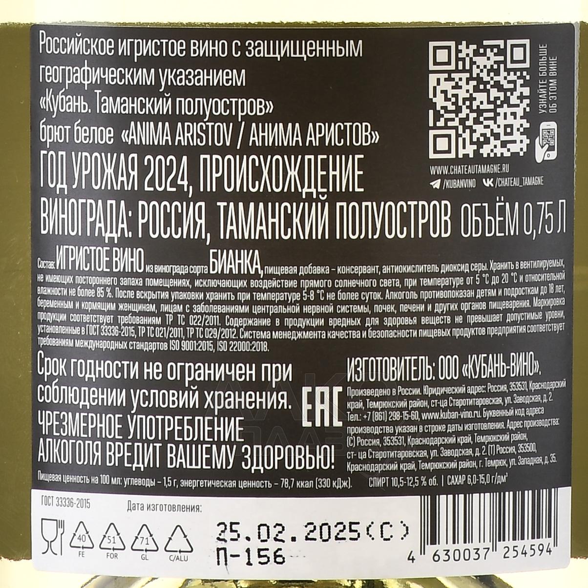 Белое сухое игристое вина Аристов Анима 0,75 л от известной российской компании Кубань-Вино содержит в основе виноград ограниченного года сбора. Обработке подверглись только спелые ягоды, отделенные от гребней: их аккуратно спрессовали и отправили в нейтральные стальные чаны для ферментации по методике Charmat.