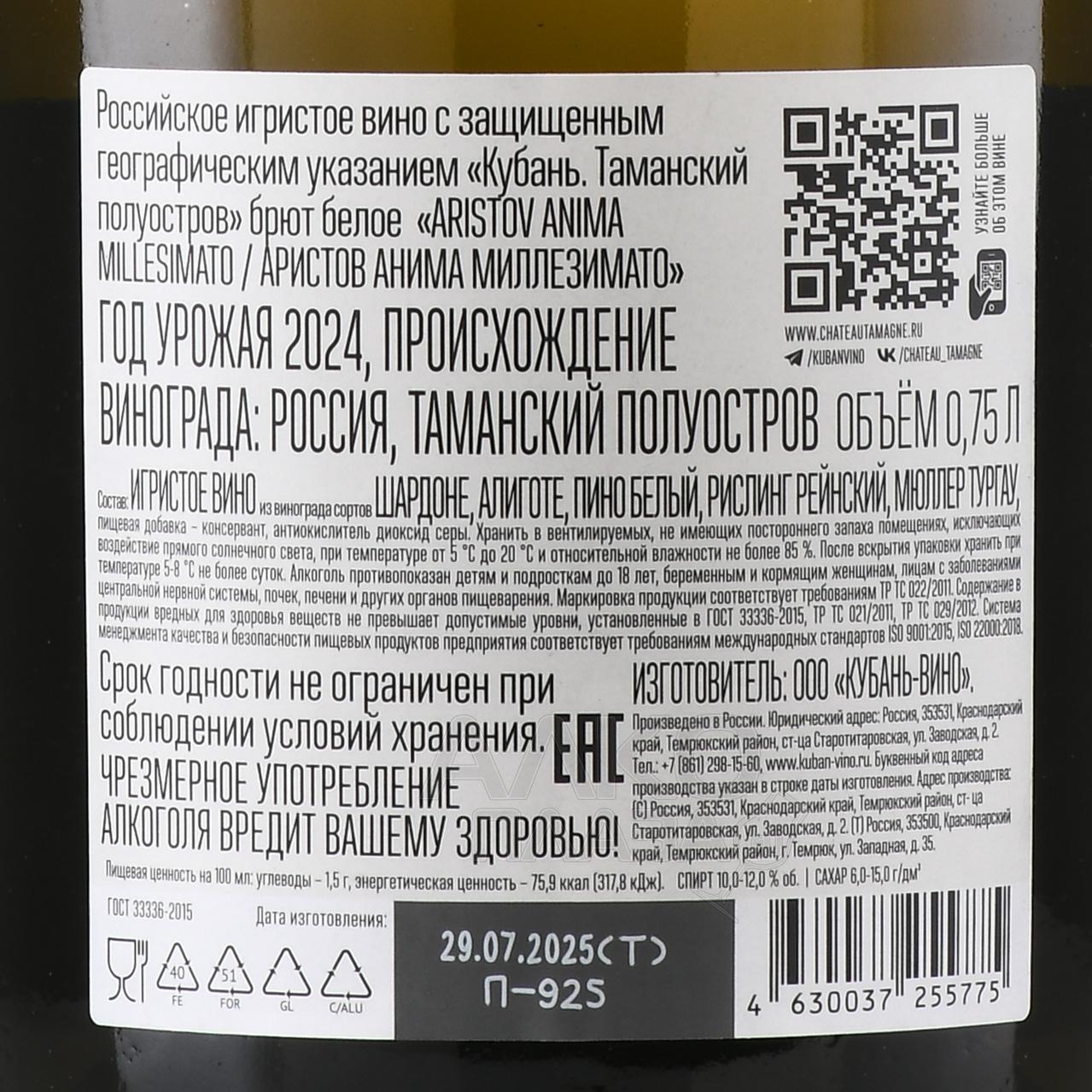 Игристое белое вино брют Аристов Анима Миллезимато 0,75 л создано с опорой на сырье из терруара Краснодарского края. Лозы здесь растут на участках с суглинистыми и известняковыми почвами в условиях высокой солнечной активности и умеренной важности. Урожай для винификации собирают выборочно, ориентируясь на стабильную кислотность и сахаристость в пределах 17–19 г/100 см³. Производство ведется методом вторичного брожения в резервуарах под давлением, что сохраняет природную свежесть и делает перляж более мягким. Применяется строгий контроль температуры, позволяющий получить чистый стиль с акцентом на естественную фруктовую основу.