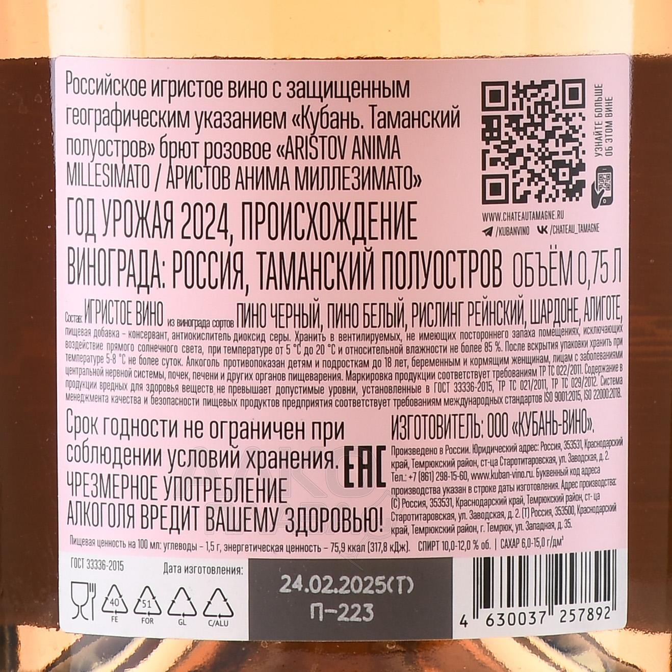 Игристое розовое вино брют Аристов Анима Миллезимато 0,75 л создаётся из урожая, собранного на каменистых склонах Тамани, где сочетание лёгких суглинков, ракушечника и близости моря обеспечивает стабильную солнечность и высокую кислотность ягод. Терруар даёт винограду плотную кожицу и яркий природный ароматический потенциал. В производстве используют ручной сбор, мягкое прессование и классический метод вторичного брожения в бутылке, после которого следует продолжительная выдержка на осадке. Такой подход формирует характерную структуру и стойкий кремовый перляж.