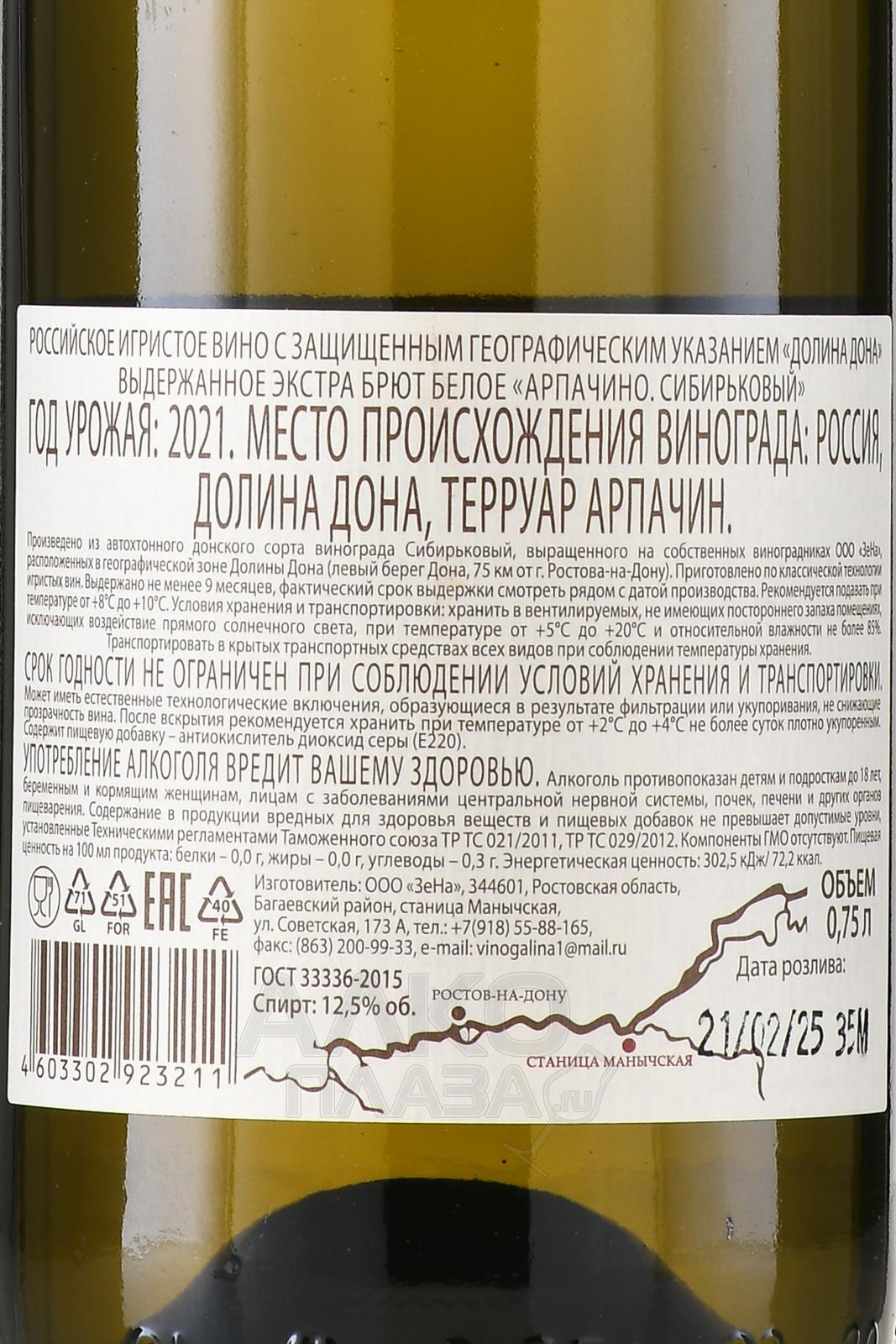 Белое сухое игристое вино Арпачино Сибирьковый — шипучий отечественный алкоголь на основе спелых ягод одноименного автохтонного винограда Ростовской области, созданный по методике ферментации в стальных чанах. Также 12-градусный напиток на протяжении 9 месяцев выдерживался в бутылке.