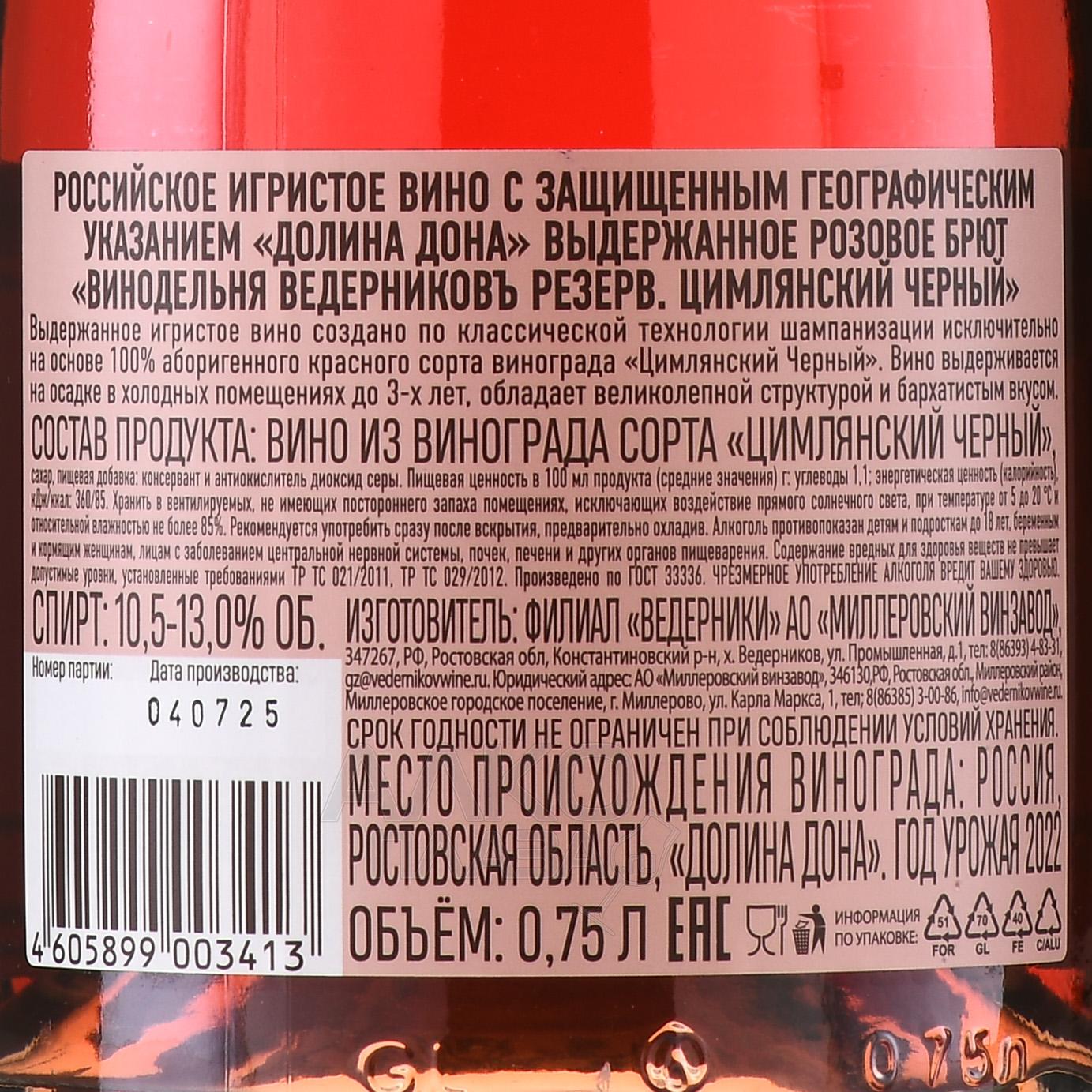 Вино игристое Ведерниковъ Резерв Цимлянский Черный 0.75 л розовое брют