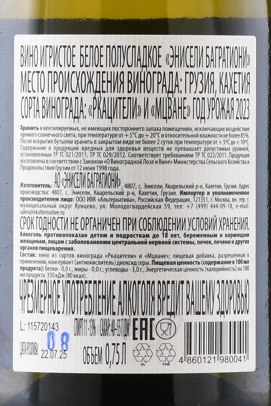 Вино игристое Энисели Багратиони 0.75 л белое полусладкое