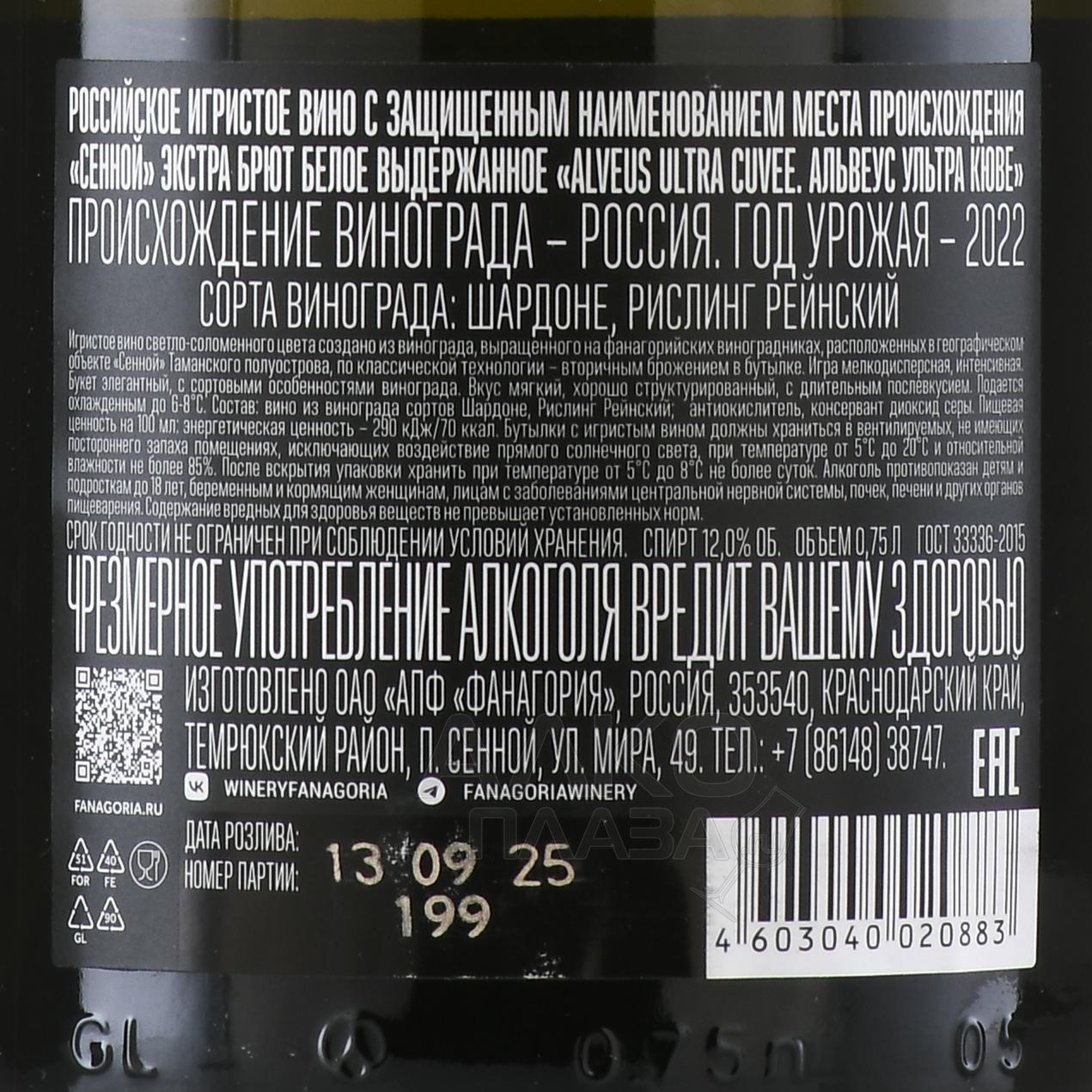Вино игристое Фанагория Альвеус Ультра Кюве 0,75 л — белый Extra Brut, созданный по классической технологии шампанизации. Виноград сортов Шардоне и Рислинг Рейнский выращивается в поселке Сенной на Таманском полуострове. Здесь умеренно жаркий климат и морские ветра способствуют сохранению кислотности и аромата ягод. Сырье в срок достигло максимальной спелости и было бережно собрано вручную. После вторичного брожения в бутылке игристое вино выдерживалось на тонком осадке не менее девяти месяцев, что придало ему сложность и глубину. Линейка Alveus Ultra Cuvée стала новым направлением в коллекции Фанагории. Сочетание свежести молодых игристых и традиционного метода шампанизации делает эти вина современными и узнаваемыми.