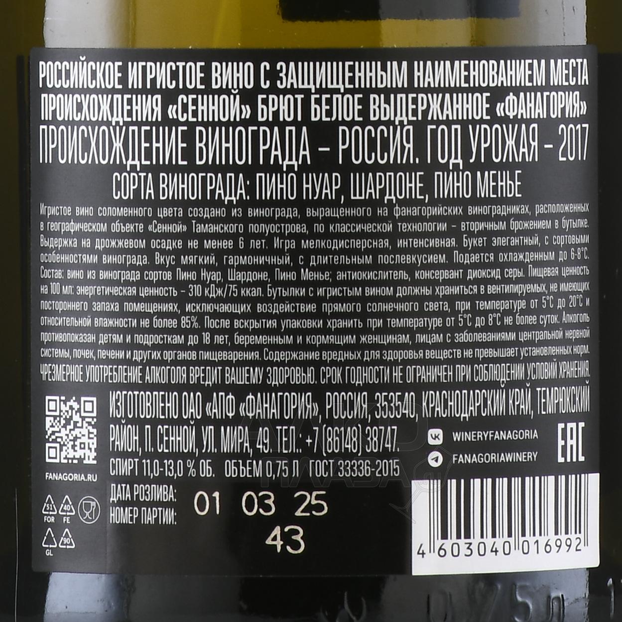 Игристое белое вино Фанагория Premium Alveus Brut ЗНМП 0,75 л произведено классическим методом (вторичное брожение в бутылке) и включено в коллекционную линейку, в которой собраны образцы из урожаев лучших годов. Элегантный брют создан из купажа традиционных шампанских сортов, которые были выращены в поселке Сенной — уникальном терруаре Краснодарского края и Таманского полуострова. Выдержка игристого вина на тонком дрожжевом осадке занимает не менее 6 лет (на это указывает римская цифра на этикетке)
