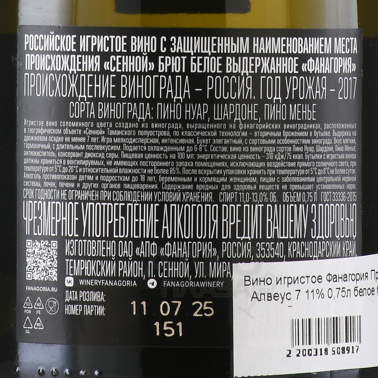 Вино игристое Фанагория Примум Алвеус VII 0,75 л — необычайно изысканное, созданное по классической шампанской технологии. Это кюве отражает потенциал терруара географического объекта «Сенной» на Таманском полуострове, где климат умеренно тёплый, а морской бриз помогает ягодам сохранять свежесть и кислотность. Виноград сортов Шардоне, Пино Нуар и Пино Менье собирали на пике зрелости вручную, чтобы сохранить целостность гроздей. Первичное брожение проходило в стали, затем — вторичное в бутылке, с выдержкой на дрожжевом осадке не менее семи лет. Этот длительный процесс придал игристому вину глубину и тонкие бисквитные оттенки. Линейка Primum Alveus — коллекционная серия Фанагории, созданная из лучших урожаев. Примум Алвеус VII получило 90 баллов в рейтинге Simple Wine News и 86 баллов от Артура Саркисяна.