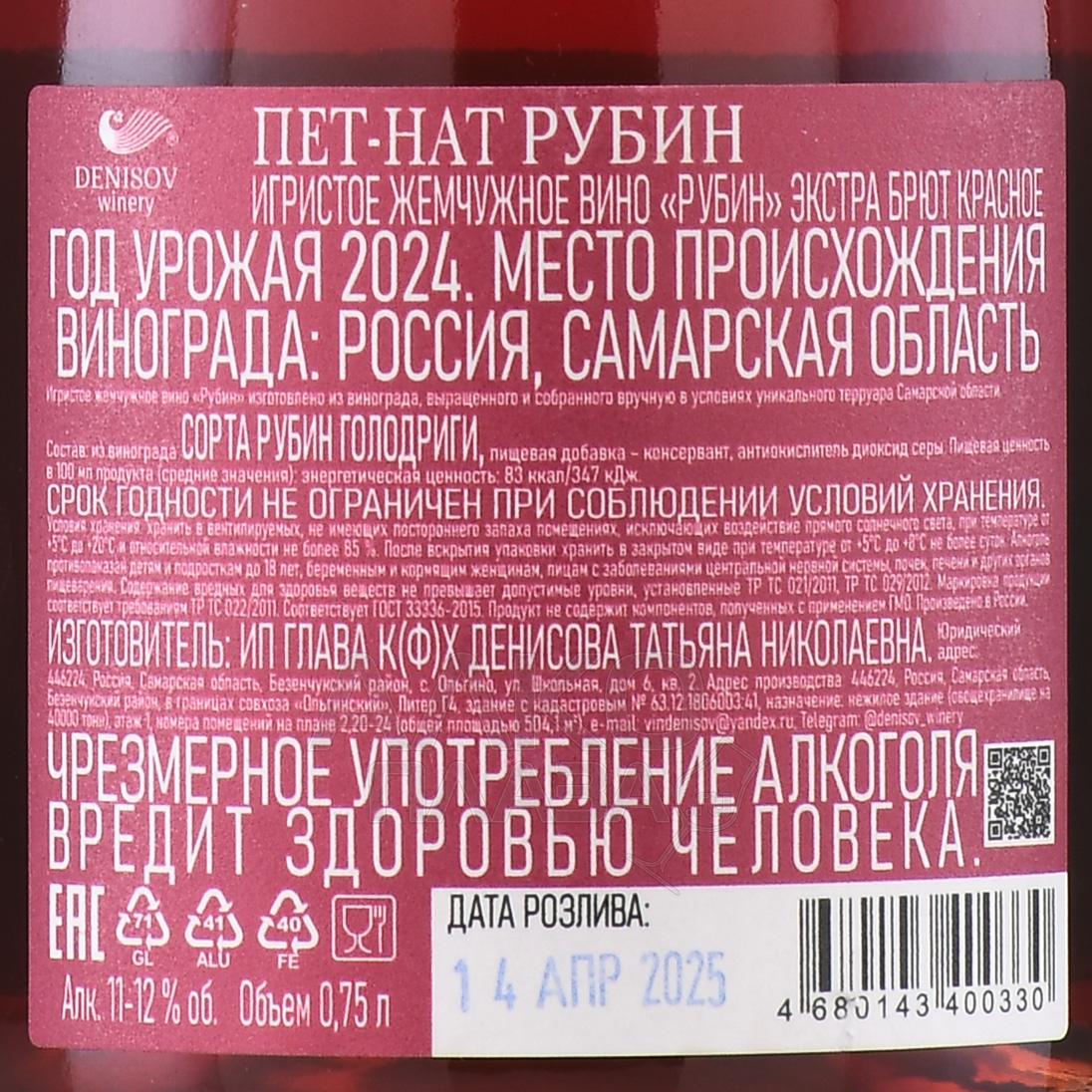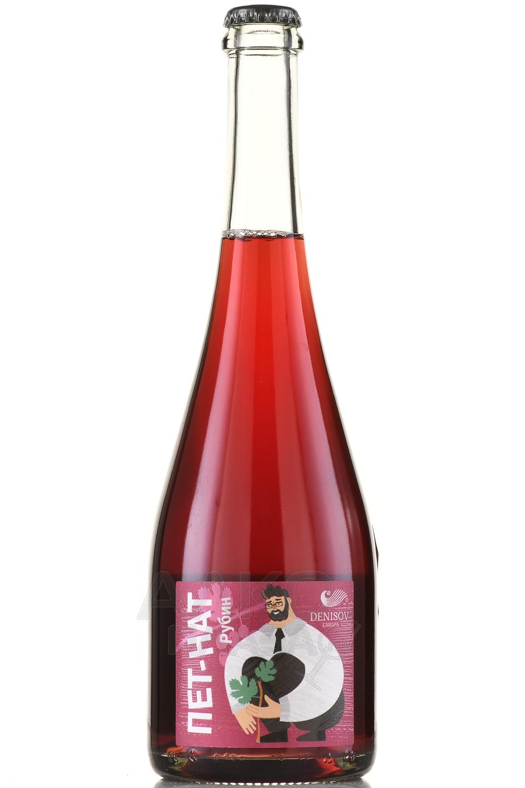 Игристое красное вино экстра-брют Пет-Нат Рубин 0,75 л производится из ягод морозостойкого сорта винограда, лозы которого выращиваются в фермерском хозяйстве Денисова Т.Н. в Самарской области. Регион характеризуется умеренно-континентальным климатом и плодородными черноземами, которые обеспечивают винограду баланс кислотности и сахара. Сезон отличался теплым и сухим летом с умеренными осадками, благоприятными для полного созревания ягод. Сусло ферментировали сначала в чанах, а затем разлили по бутыклкам, не дожидаясь окончания процесса брожения. Благодаря этому сохранились натуральная карбонизация и легкий осадок дрожжей, придавшие напитку особую текстуру и вкус.