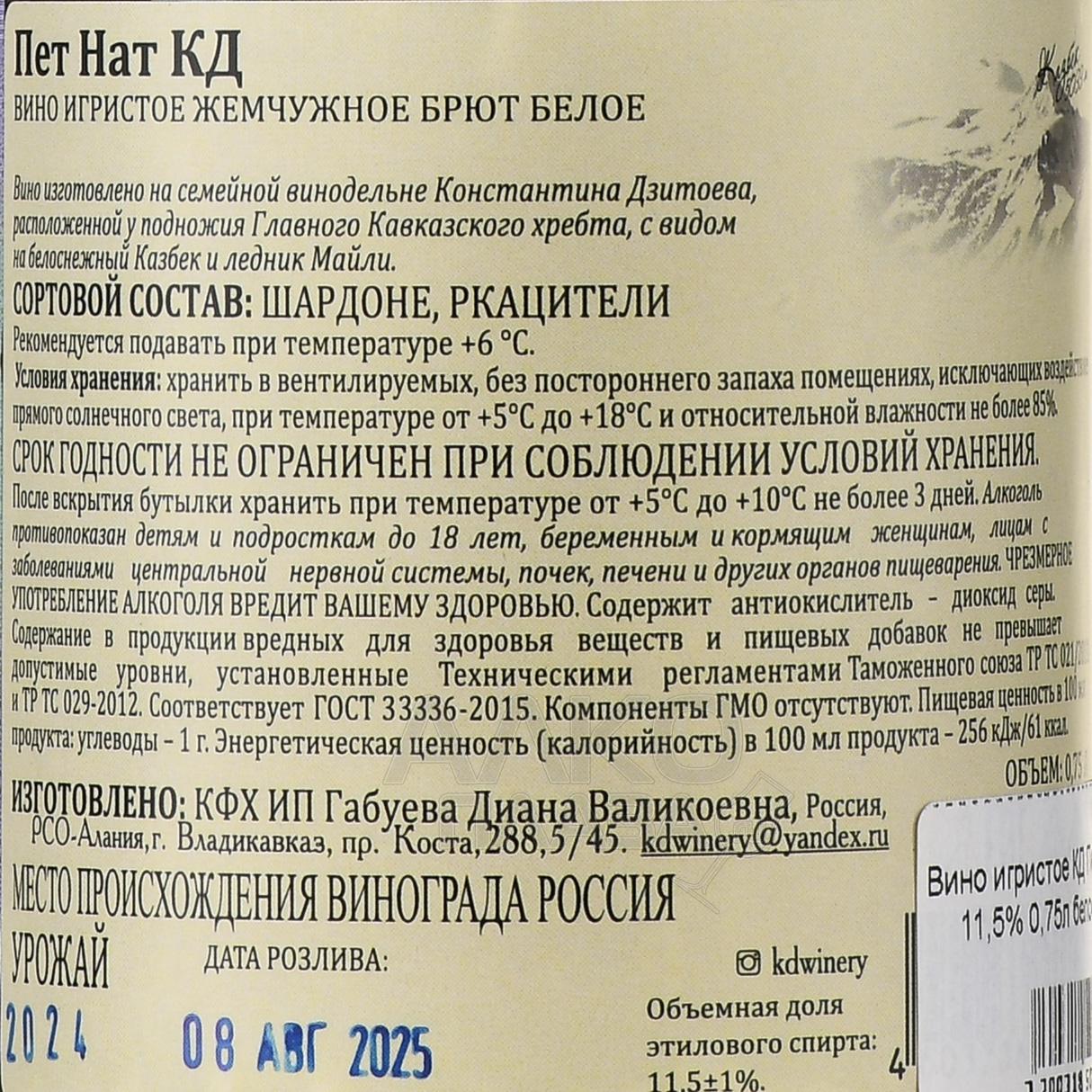 Вино игристое Пет Нат Шардоне Константин Дзитоев 2024 года 0,75 л — это белый брют, созданный в стиле натурального пет-ната с минимальным вмешательством винодела. Виноград выращен в Северной Осетии, в окрестностях Владикавказа, у подножия Главного Кавказского хребта, где почвы богаты минералами, а климат континентальный с прохладными ночами и солнечными днями. Урожай 2024 года оказался удачным: лето было теплым, но без экстремальной жары, осень сухая и ровная, что позволило собрать ягоды в оптимальной зрелости. Ферментация проходила естественным образом в бутылке, без добавления сахара и дрожжей, что дало вину характерные для пет-ната легкие осадочные ноты и живую пену. Выдержка была короткая, что позволило сохранить свежесть и натуральный вкус сорта. Бутылка расписана вручную, поэтому имеет уникальный дизайн.