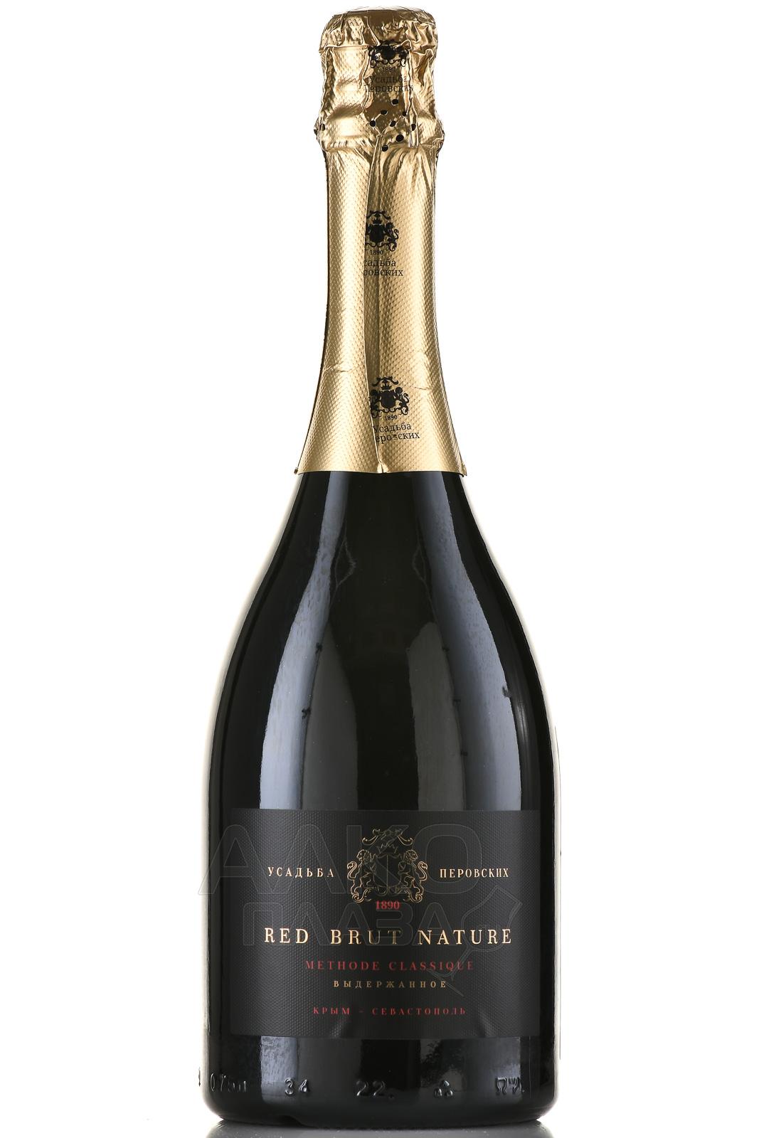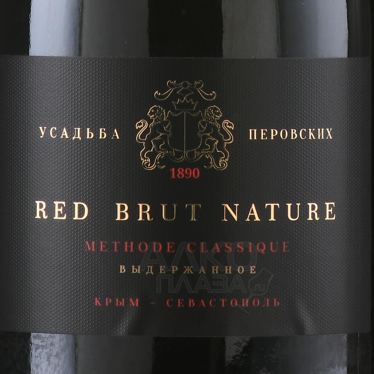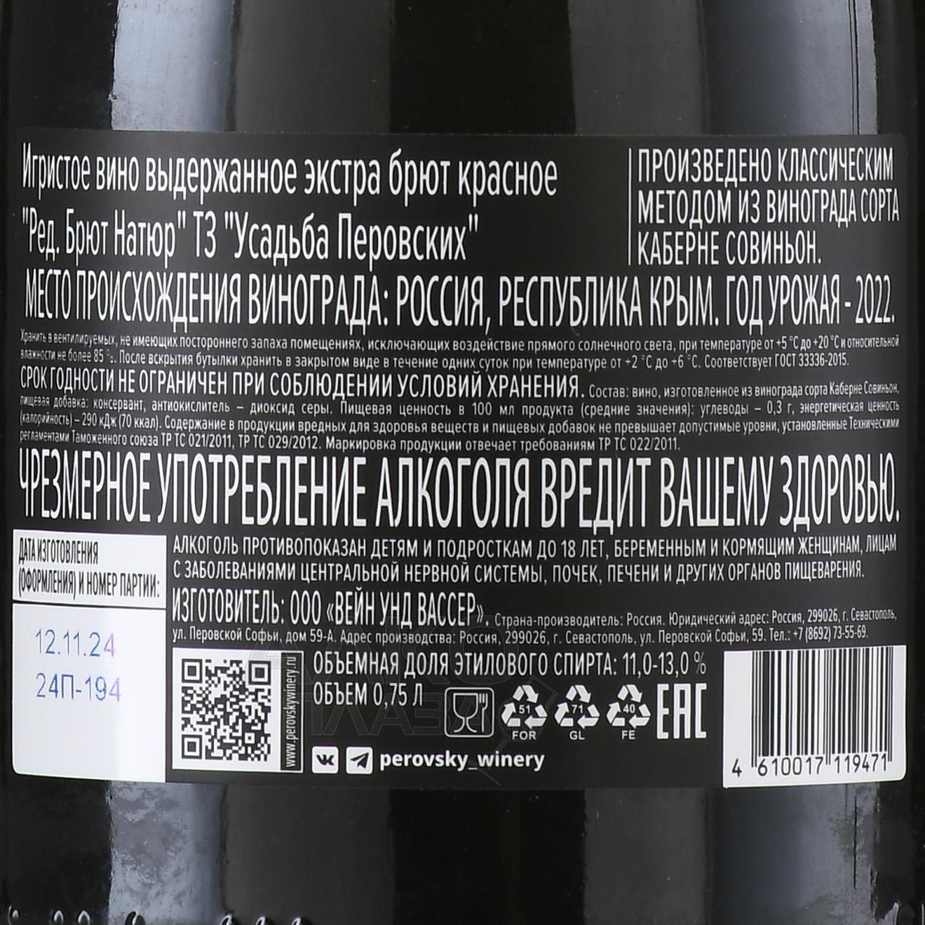Вино красное игристое Ред Брют Натюр Усадьба Перовских 0,75 л – экстра-брют, выпущенный лимитированным тиражом не более 1100 экземпляров. Он создан из ягод одного сорта винограда – Каберне Совиньон. Урожаи, созревшие в крымском терруаре, аккуратно собрали и отправили на завод для переработки по классической технологии. Первичная алкогольная ферментация проходила в стальных емкостях, а пузырьками газа напиток насыщался уже в бутылках. Когда этап шампанизации завершился, спиртное выдержали на дрожжевом осадке на протяжении 24 месяцев.