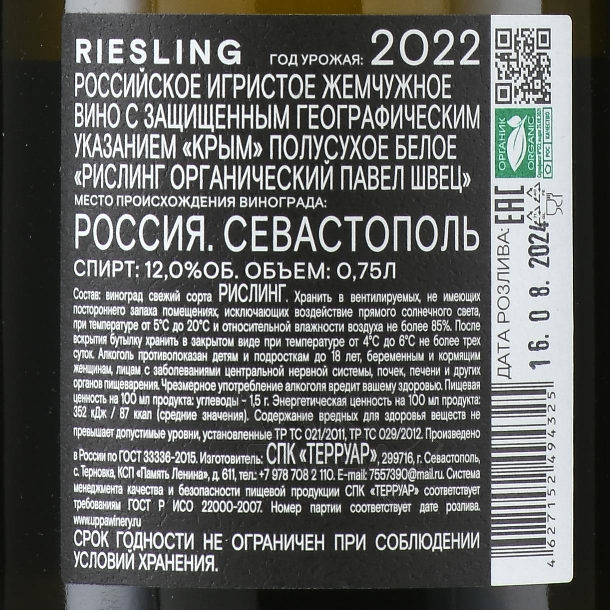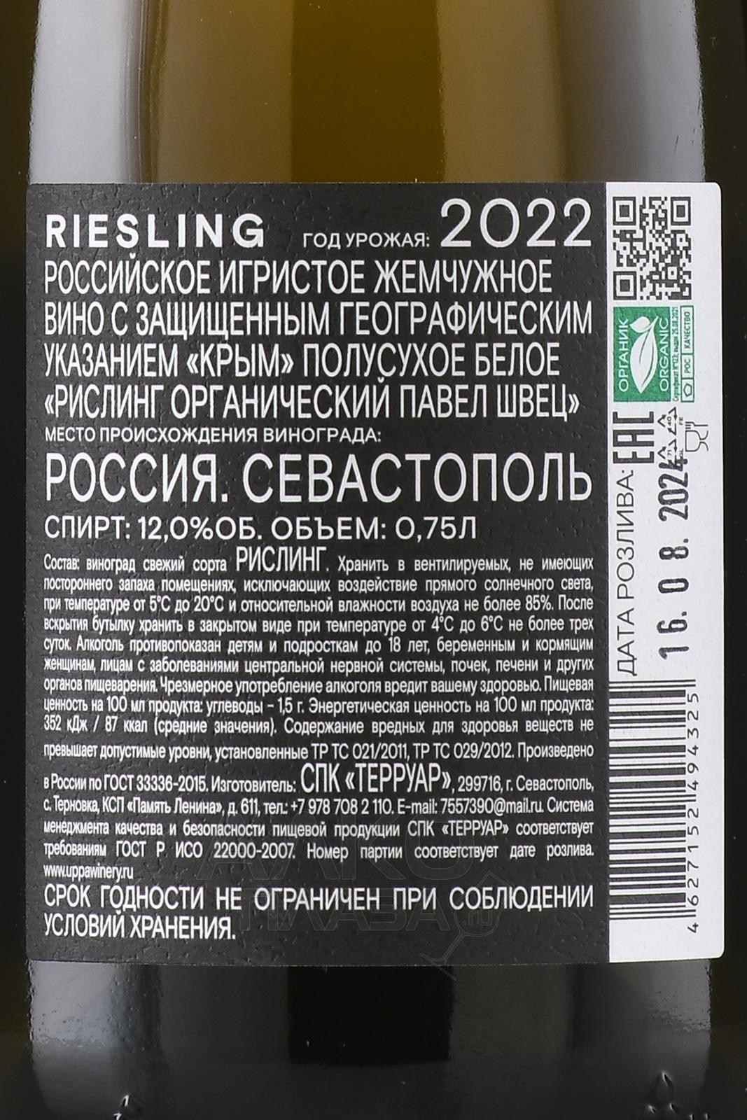 Вино игристое белое полусухое Рислинг органический Павел Швец 0,75 л – жемчужный пет-нат от первого российского сомелье-винодела и пионера отечественной винной биодинамики. Напиток изготовлен старинным методом ансестраль – отжатый из ягод сок ферментировали при низких температурах в течение 9 дней, а затем разлили по бутылкам, где процесс брожения продолжился. Перед окончательной укупоркой был проведен дегоржаж – удаление дрожжевого осадка из спиртного. Виноград, использованный в винификации, созрел на лозах, получающих влагу только естественным путем. Легкий водный стресс стимулировал развитие корневой системы растений, из-за чего плоды получились довольно мелкими, но с концентрированной органолептикой, придавшей вину многогранный характер.