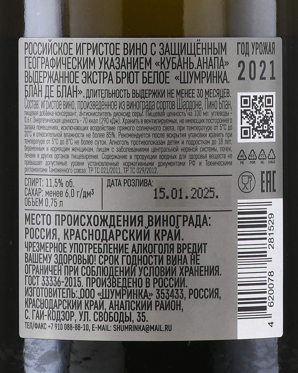 Белое игристое вино Шумринка 0.75 л — выдержанный российский экстра-брют от частной винодельни из Кубани, созданный из купажа вручную собранного белого винограда сортов Шардоне и Пино Блан, которые были выращены на склонах хребта Семисам возле Анапы и собраны в определенный год. Игристое вино было создано по классическому способу при помощи выдержки на осадке в течение трех лет.