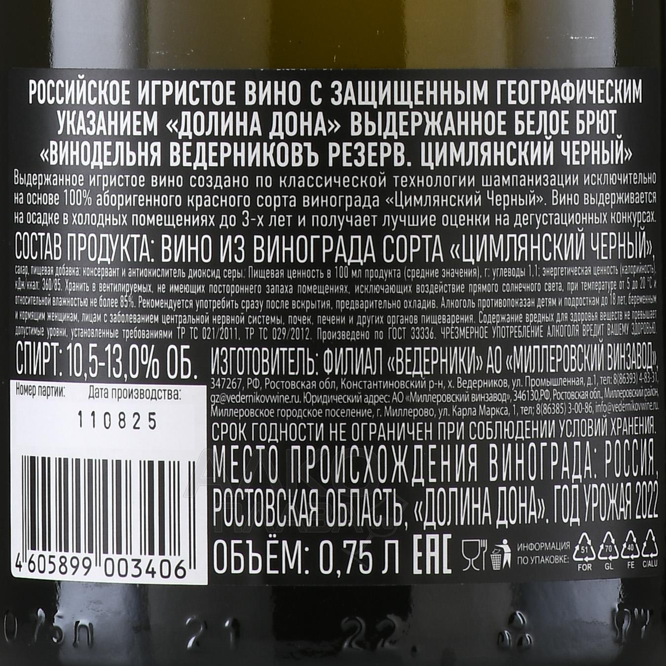 Вино игристое Ведерниковъ Резерв Цимлянский Черный 0.75 л белое брют