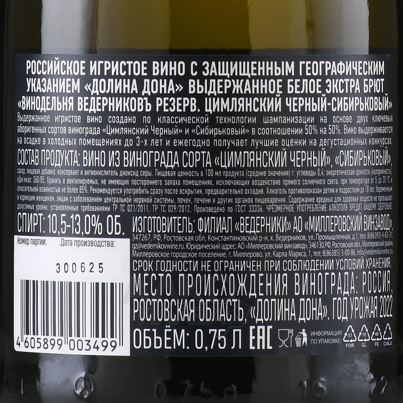 Вино игристое Ведерниковъ Резерв Цимлянский черный/Сибирьковый 0.75 л белое экстра брют