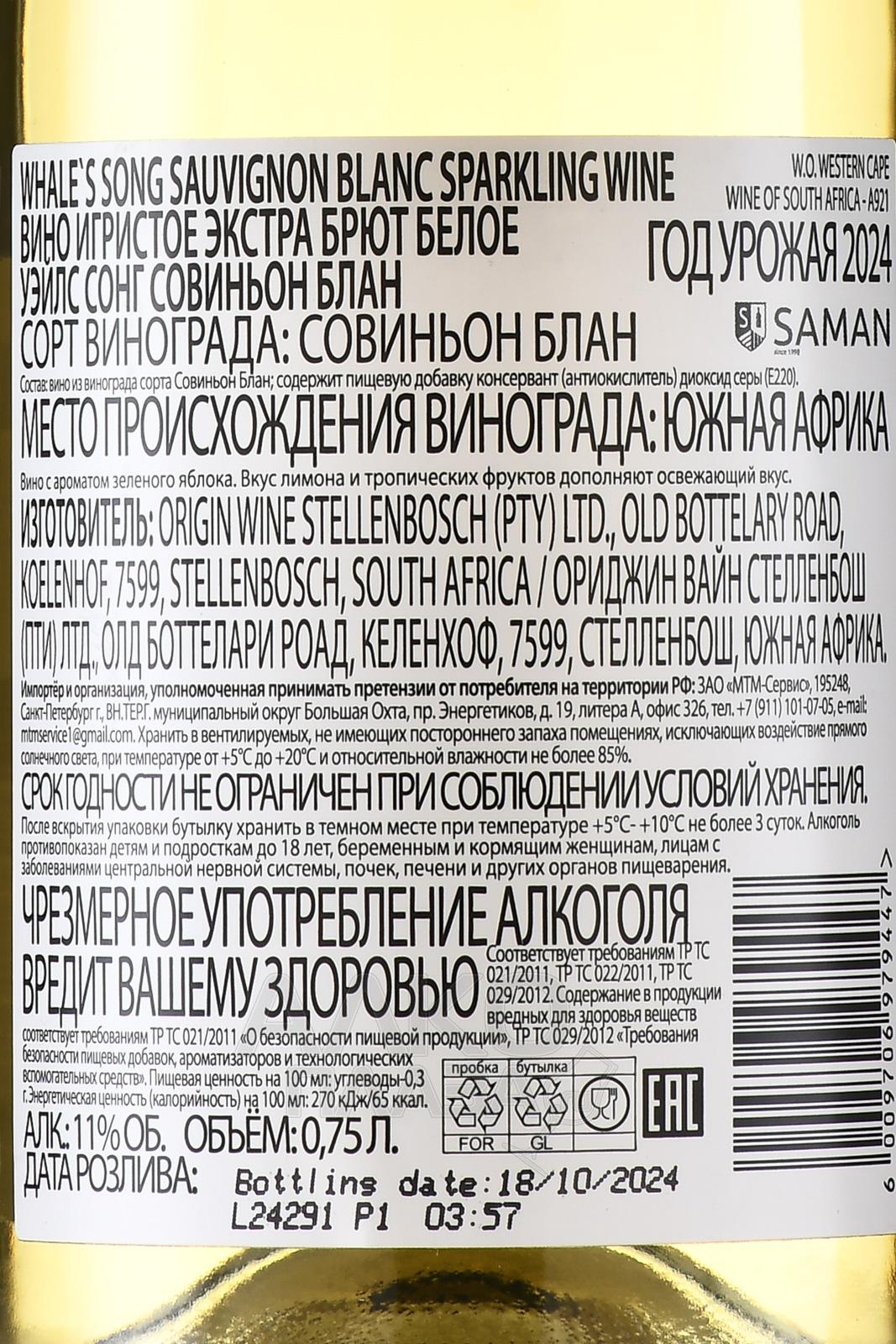 Whale’s Song Sauvignon Blanc - вино игристое Уэйлс Сонг Совиньон Блан 0.75 л белое экстра брют