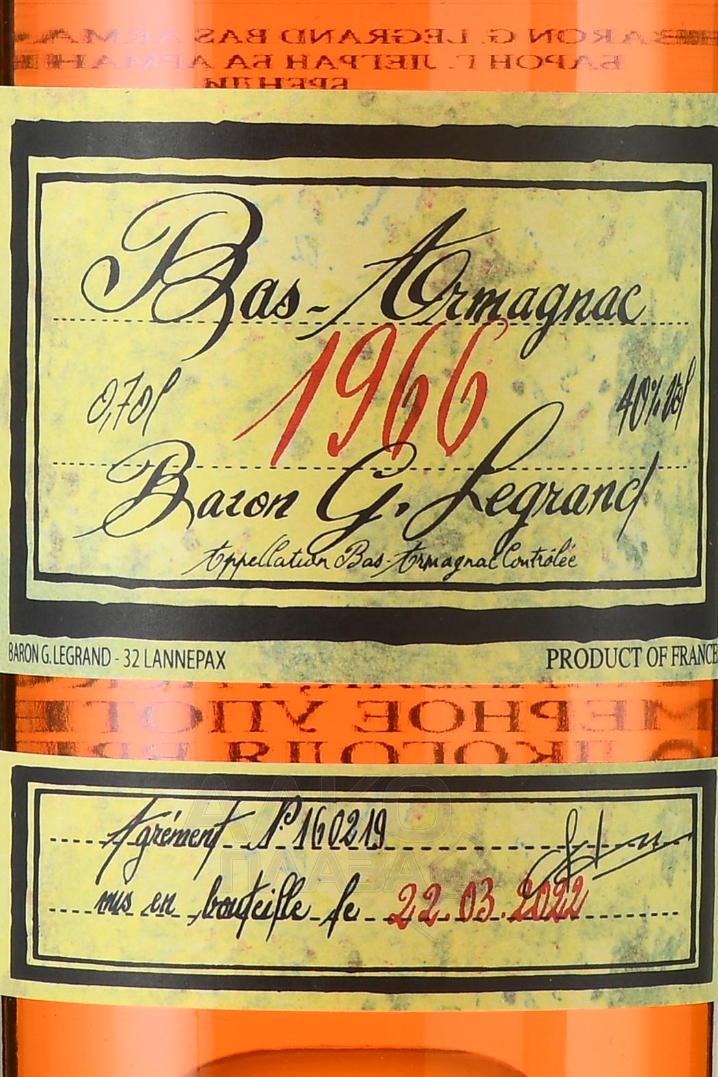 Арманьяк Baron G. Legrand 1966 года, 0,7 л, представляет собой изысканный напиток, произведенный французским домом Легран. Он использовал старые спирты из собственных запасов. Их отбирал мастер погреба вручную из нескольких бочек и затем смешивал по авторской рецептуре. Этот редкий миллезимный арманьяк создан из винограда урожая 1966 года, что подчеркивает его уникальность и исключительное качество. Производство включало однократную дистилляцию белого вина из сортов Уни Блан и Бако, выращенных в регионе Нижний Арманьяк. Выдержка осуществлялась в гасконских дубовых бочках не менее 56 лет. Редкий винтаж, выпущенный маленьким тиражом, - это люксовый подарок для ценителя и коллекционера.