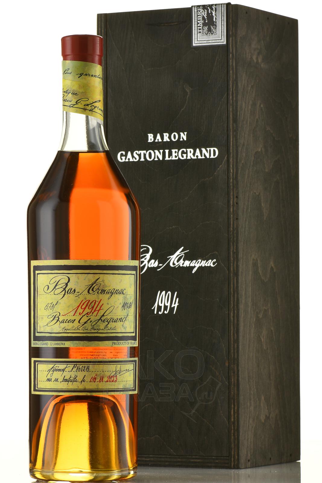 Арманьяк Baron G. Legrand 1994 года 0,7 л представляет собой высококачественный миллезимный напиток из региона Ба-Арманьяк во Франции. Производство осуществлялось традиционным методом непрерывной перегонки, после чего дистиллят выдерживался в дубовых бочках из гасконского дуба не менее 29 лет. Уникальность этого арманьяка заключается в использовании урожая только одного года, который был удачным в плане погоды. Зима выдалась мягкой и влажной, весна сухой и теплой, что способствовало раннему распусканию и цветению лозы. Первая половина лета была жаркой, но в августе прошли обильные дожди. В сентябре заметно похолодало, что несколько затормозило созревание винограда, однако это пошло ему только на пользу. В итоге качество ягод было великолепным, а миллезим из урожая 1994 года получился роскошным и благородным по своему характеру. Редкий алкоголь в стильной упаковке станет отличным подарком для ценителя по любому торжественному поводу.