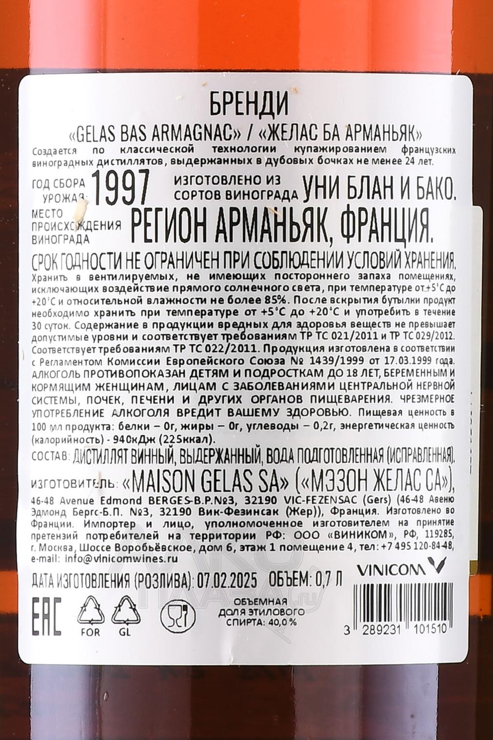 Gelas 1997 - арманьяк Желас 1997 года 0.7 л