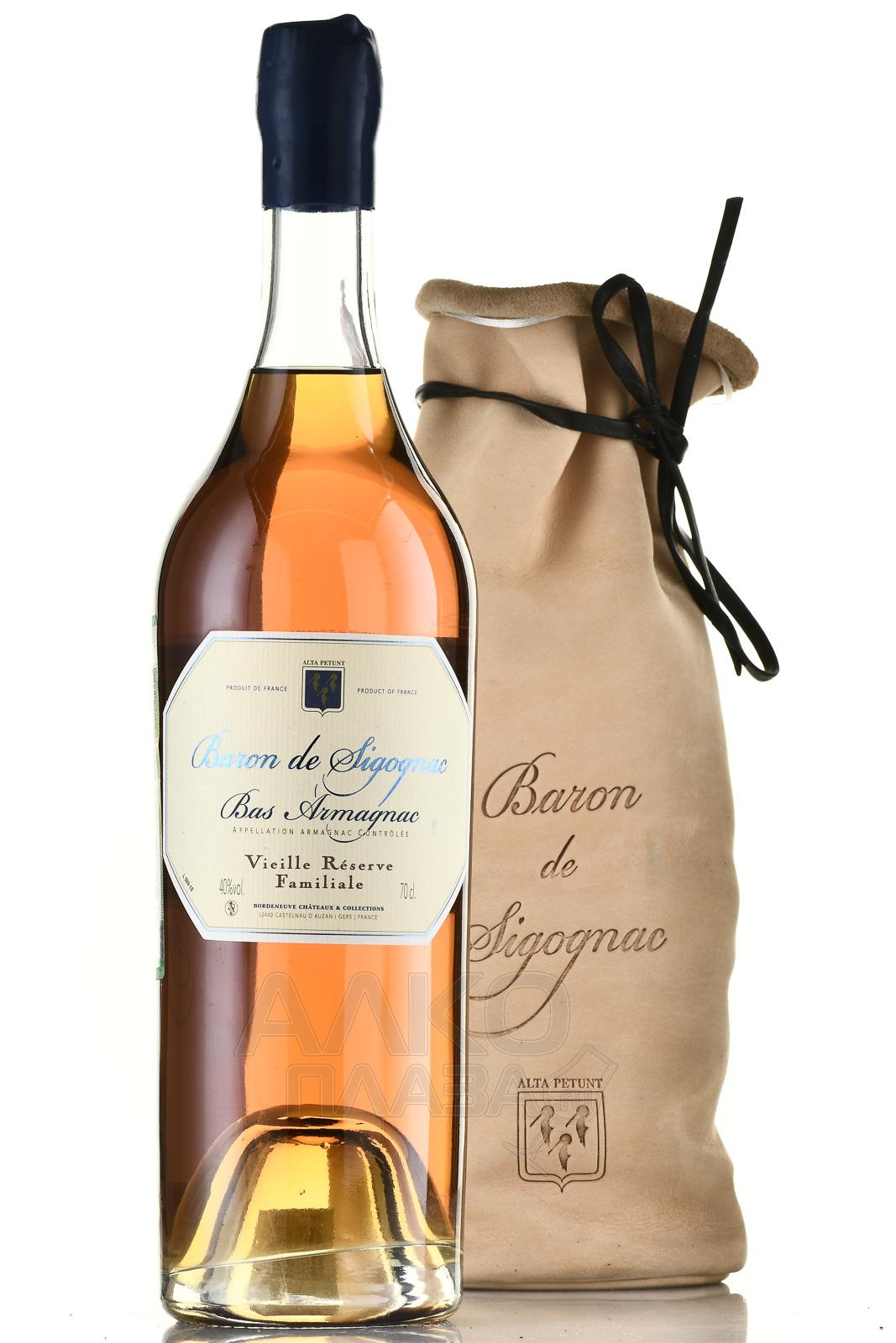 Арманьяк Baron de Sigognac Vieille Reserve Familiale 0,7 л разлит по классическим бутылкам, пронумерованным для защиты от подделки, в комплекте с необычными подарочными упаковками — красивыми мешочками из телячьей кожи с гравировкой компании-изготовителя. Производство напитка 40-градусной спиртуозности осуществилось в области Armagnac путем перегонки ферментированного виноградного сусла в специальных аламбиках. Перед бутилированием провели процедуру выдержки в гасконском дубе продолжительностью около 70 лет.