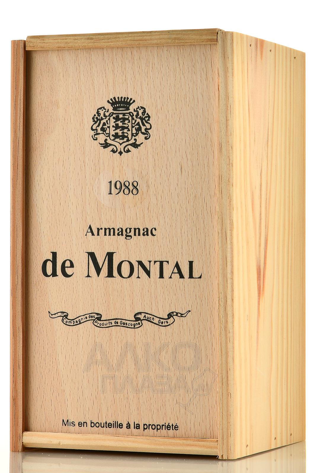 Арманьяк де Монталь 1988 года урожая произведен из винограда выращенного в зоне Ба-Арманьяк. Получившиеся вино дистиллировали с ноября по конец декабря в 3-х медных колоннах непрерывного цикла. Выдержка спиртов производилась в бочках объёмом 400 литров.
