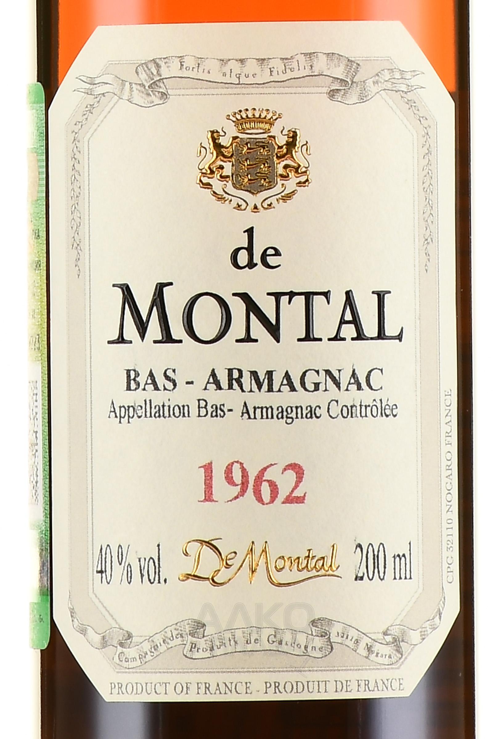 Арманьяк de Montal Bas Armagnac 1962 год 0,2 л — дорогостоящий элитный экземпляр французского алкогольного искусства, который создали в классических арамбиках и бочках из четырех автохтонов Гаскони, собранных в границах знаменитой зоны Нижний Арманьяк. После непрерывной перегонки ферментированного ягодного сырья спирты разлили по бочонкам из монлезонскго дуба и баррикам из ценной древесины Ле Фреш, где дистилляты находились не один десяток лет. Розлив по 200-миллилитровым стеклянным бутылкам провели по завершении редукции градуса до требуемых сорока процентов. Арманьяк покупают с целью ознакомления с напитком перед приобретением большой версии или как коллекционный экземпляр для собрания миниатюр премиального спиртного.