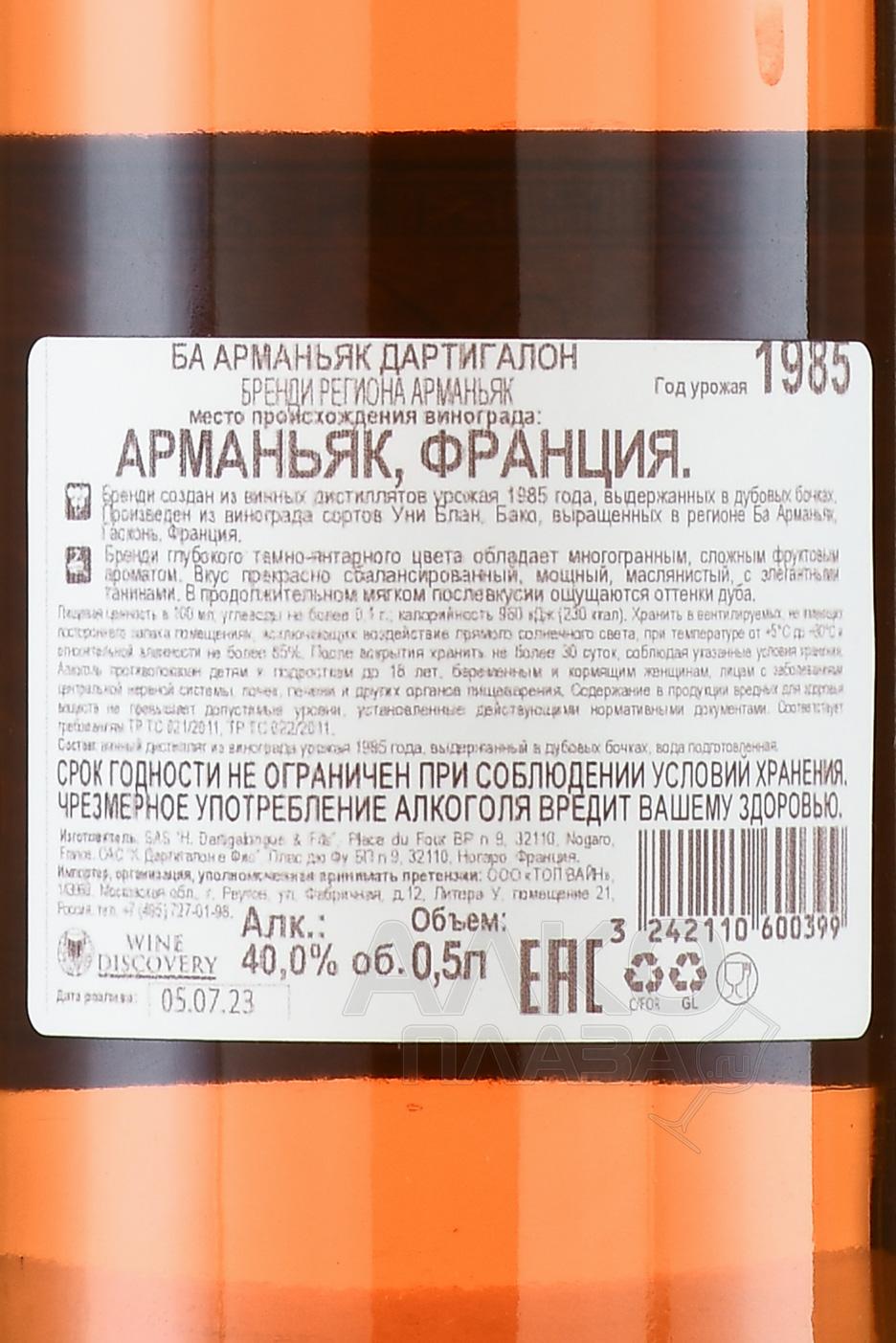 Dartigalongue 1985 - арманьяк Дартигалон 1985 года 0.5 л