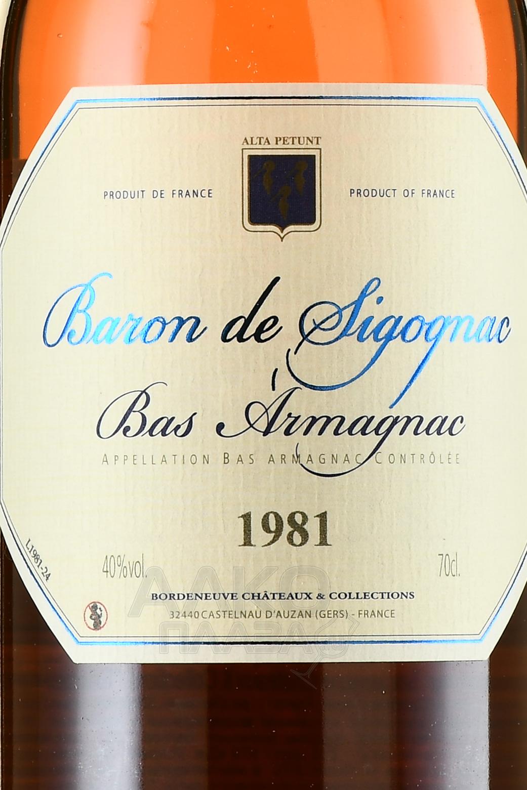 Арманьяк Baron de Sigognac 1981 г. 0,7 л в д/у – один из образцов драгоценной коллекции винтажей именитого французского бренда, включающей много редких коллекционных вариаций. Напиток изготовлен традиционными методами – путем перегонки и выдержки в дубе белых сухих вин. Сырьем для спиртного послужили урожаи с собственных виноградников компании, разбитых в благодатном терруаре субрегиона Bas Armagnac – местности, известной своими утонченными и многогранными о-де-ви. Сброженное из ягод популярных региональных сортов сусло медленно перегнали в старом медном кубе, созданном еще в 1920 году. Далее последовала долгая выдержка в гасконском дубе, где спирты созревали около 40 лет. Великолепный купаж в благородном подарочном дизайне может стать презентабельным сувениром для особых торжеств.