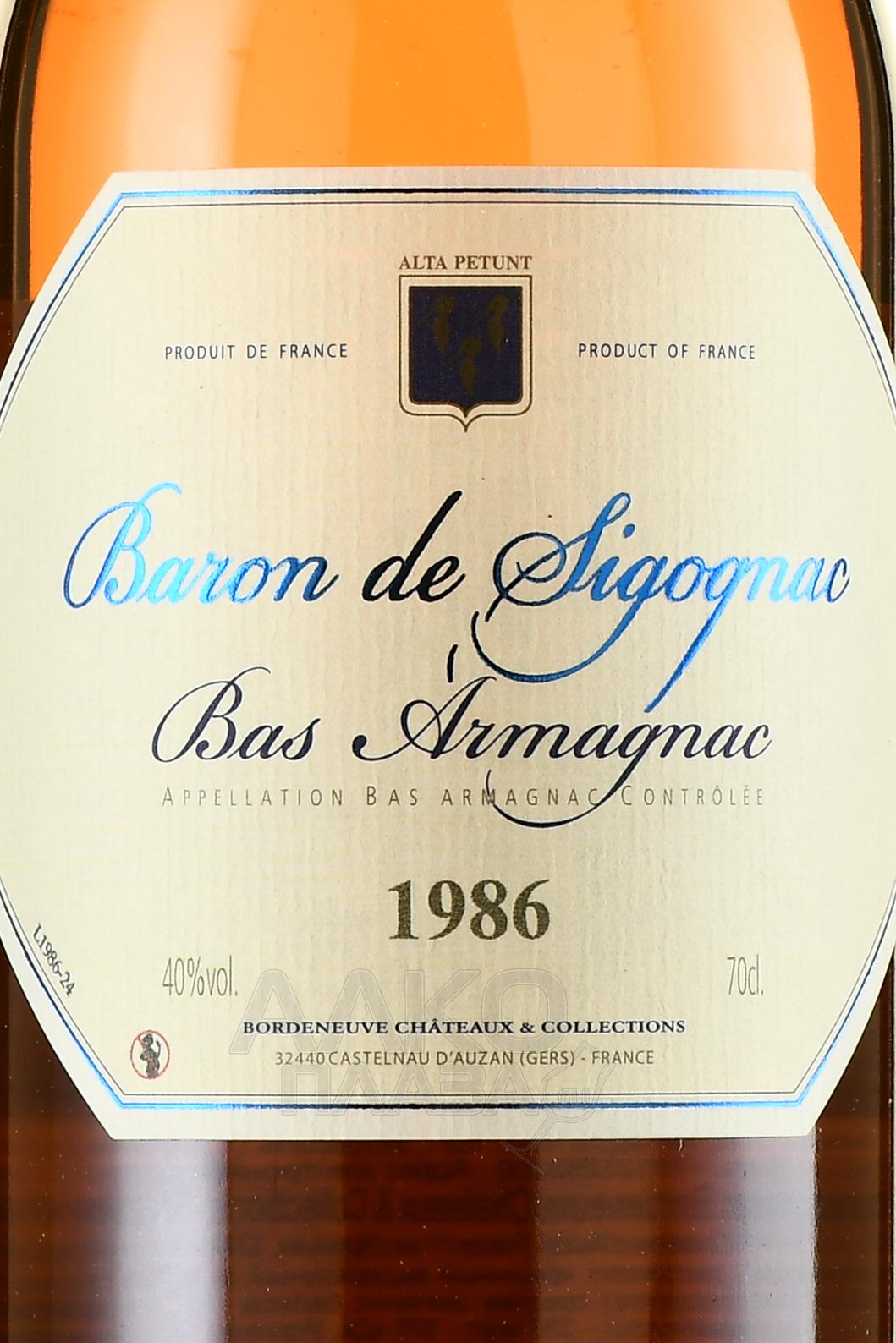 Арманьяк Baron de Sigognac 1986 года 0,7 л в д/у — подарок элитного уровня для особенно торжественного повода. Им может стать юбилей человека, родившегося в год урожая, годовщина свадьбы и т. п. Роскошный винтаж в стильном деревянном ящичке займет достойное место в коллекции ценителя редкого алкоголя. В 1986 году виноградники региона Ба-Арманьяк погодные катаклизмы обошли стороной: весна выдалась теплой, лето умеренно сухим и солнечным, осень — без сильных осадков. Качество ягод было отличным, поэтому стало возможным произвести миллезимную версию. Раритетный арманьяк был выдержан в бочках из черного гасконского дуба не менее 34 лет и бутилирован в январе 2024 года.