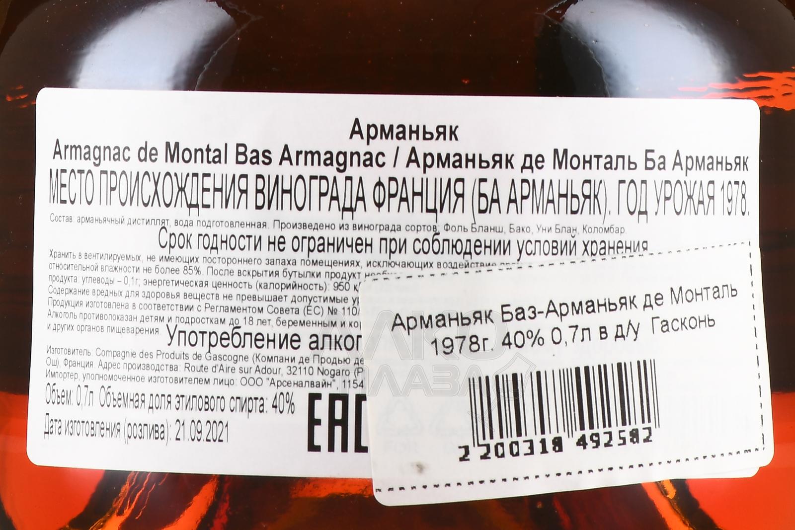 Арманьяк de Montal Bas Armagnac 1978 г. — французский сорокаградусный напиток защищенного географического наименования из провинции Гасконь, созданный в апелласьоне Нижний Арманьяк из разрешенных местных сортов винограда. Ягоды были собраны вручную в один урожайный год на плантациях, сложенных глиной и кремнием. Их подвергли сортировке, ферментации и непрерывной перегонке в трех медных аутентичных колоннах. Вызревание осуществилось в больших барриках из древесины французского белого дуба (вместимость 400 л) и продлилось несколько десятилетий. Арманьяк в стеклянных бутылках комплектуется сувенирными деревянными боксами в классическом стиле.