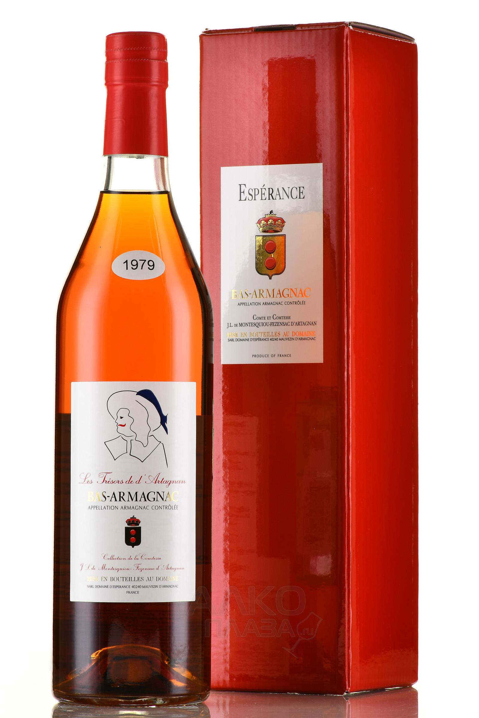 Арманьяк Bas-Armagnac Domaine d`Esperance Les Tresors de d`Artagnan 1979 года в п/у является винтажом категории premium, который был высоко оценен экспертами и критиками. Он произведен из традиционных белых сортов Гаскони, которые выращиваются в регионе Ба-Арманьяк. Спирты были получены в результате медленной дистилляции в медных кубах шарантского типа. Арманьяк выдерживался в новых и старых бочках из черного гасконского дуба не один десяток лет и был бутилирован при крепости 40%. Это прекрасный подарок для человека, родившегося в 1979 году.