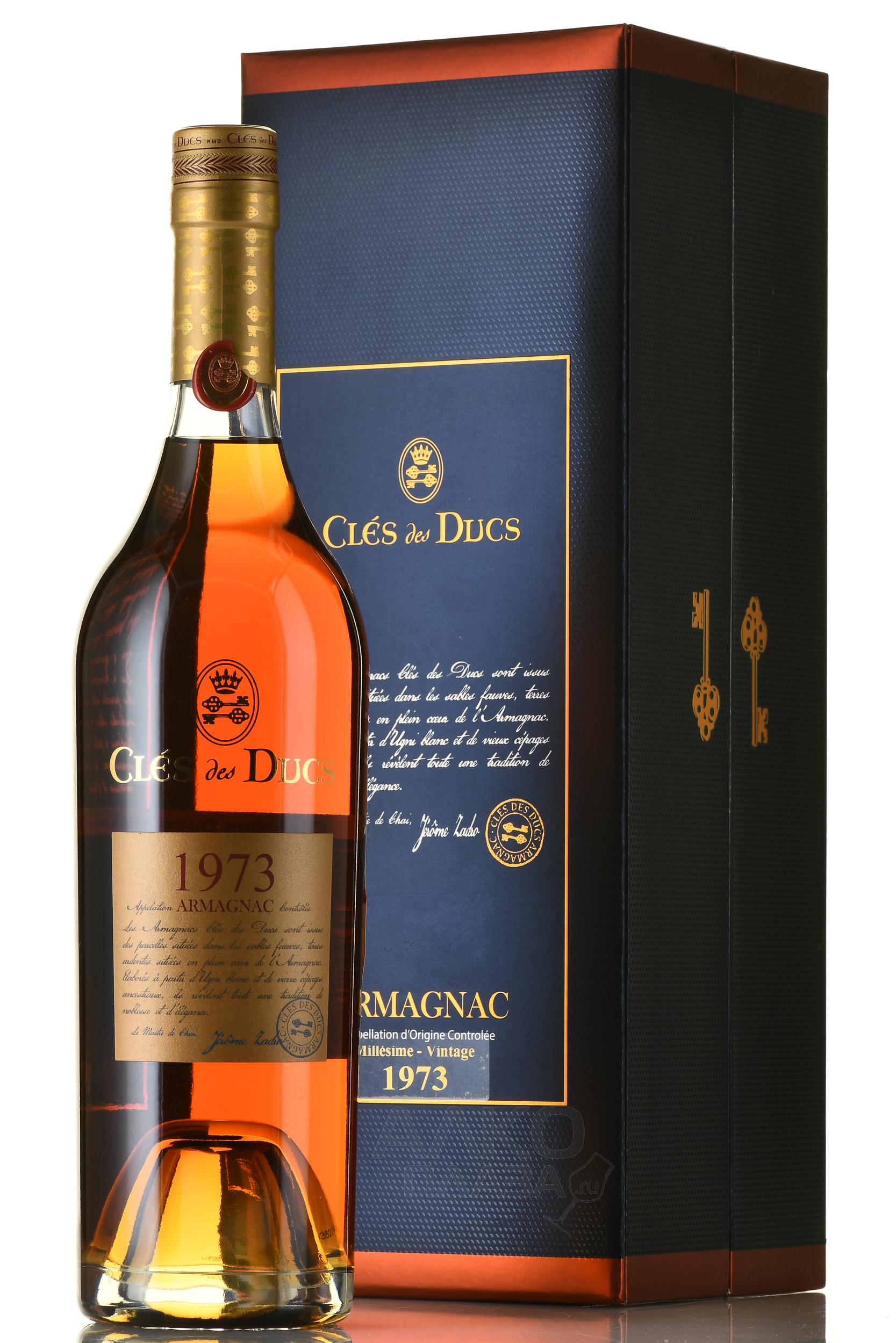 Арманьяк Cles des Ducs 1973 год 0.7 л в п/у — винтажный алкоголь Франции из Гаскони, созданный из отборного винограда Уни Блан, который был собран в 1973 году в регионе Арманьяк. Дистилляты выдерживаются долгое время в барриках из древесины лимузенского дуба в собственных подвалах именитого производителя Кле де Дюк. Миллезимный арманьяк выпускается в подарочной коробке, это памятный презент именинникам, рожденным в 1973 году.
