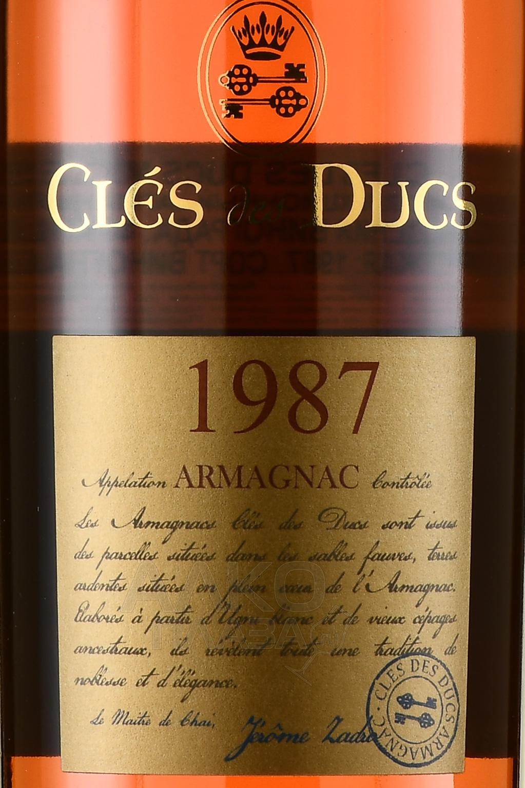 Арманьяк Cles des Ducs 1987 год 0.7 л в п/у — коллекционный моносортовой французский бренди из региона Armagnac в деревянной упаковке, который создается из сорта Уни Блан, выращенного на виноградниках Ба-Арманьяк и собранного а один год. Арманьячные дистилляты выдерживаются в бочках из лимузенского дуба в собственных подвалах именитого дома Кле де Дюк. Винтажный armagnac 1987 года станет памятным подарком ровеснику напитка и коллекционеру.