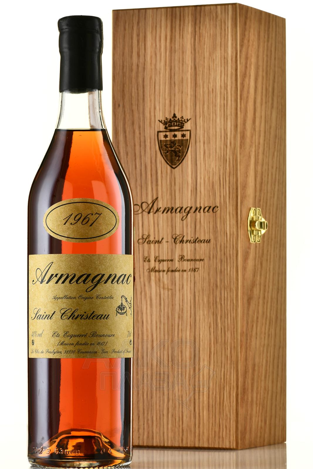 Armagnac Saint Christeau Millesime 1967 года 0.7 л в п/у — суперпремиальный гасконский миллезим, созданный одной из именитых старейших компаний Франции из лучших сортов Уни Блан и Коломбар, которые были выращены нв виноградниках Верхнего Арманьяка. Именитый арманьячный дом Сент Кристо специализируется на винтажных напитках, полученных из спиртов конкретного урожайного года. Выдержка дистиллятов в течение 55 лет проходит в гасконских бочках из древесины черного дуба, далее спирты переливают в другие старые бочки — за это время крепость напитка ежегодно уменьшается на 0,5 градуса. Миллезимный арманьяк с уровнем спиртуозности 40 градусов — статусный презент именинникам, родившимся в 1967 году, и коллекционерам.