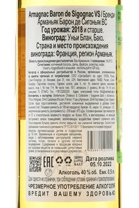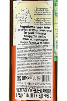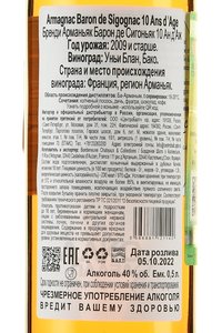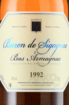 Арманьяк Baron de Sigognac – спиртной напиток класса «супер-премиум», входящий в число самых известных алкогольных произведений Франции. Арманьяки торговой марки готовятся домом Шато де Борденев, который расположен в регионе Нижний Арманьяк и находится под управлением крупной компании Adex. Здание шато было выстроено в XVII веке в живописном местечке Кастельно д`Озен, которое славится неповторимым терруаром. Влажный, мягкий климат и песчаные почвы, богатые оксидом железа, гарантируют получение выдающегося винограда, способного передать мощную ароматику готовому напитку. Арманьяк Baron de Sigognac назван в честь знаменитого персонажа французской истории – рыцаря Барона де Сигоньяка, который, по легенде, посвятил жизнь поиску рецепта идеального гасконского напитка.