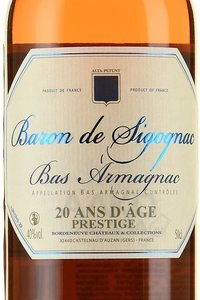 Элитный алкоголь готовится из классических сортов винограда Уни Блан и Бако и проходит многолетнюю выдержку в погребах замка, заложенных несколько столетий назад. Старение протекает в барриках из черного гасконского дуба. Аутентичный стиль достигается за счет соблюдения традиционных рецептур. В рамках завода не применяют электрическое нагревание, а дистилляция осуществляется горячим паром, в результате чего спирты приобретают мягкий букет. В коллекцию Барон де Сигоньяк вошли купажи возрастом от 10 до 20 лет, а также лимитированные миллезимы, дистиллированные более 50 лет назад. Премиальный арманьяк Baron de Sigognac – это символ высокого стиля и элегантности. Напитки подают в самых престижных ресторанах мира и приобретают для частных коллекций. Вкусоароматическая палитра раскрывается грациозными отголосками чернослива, ванили, фиников, сладкой выпечки, кофе и кедра в сочетании с благородными аккордами рансио.