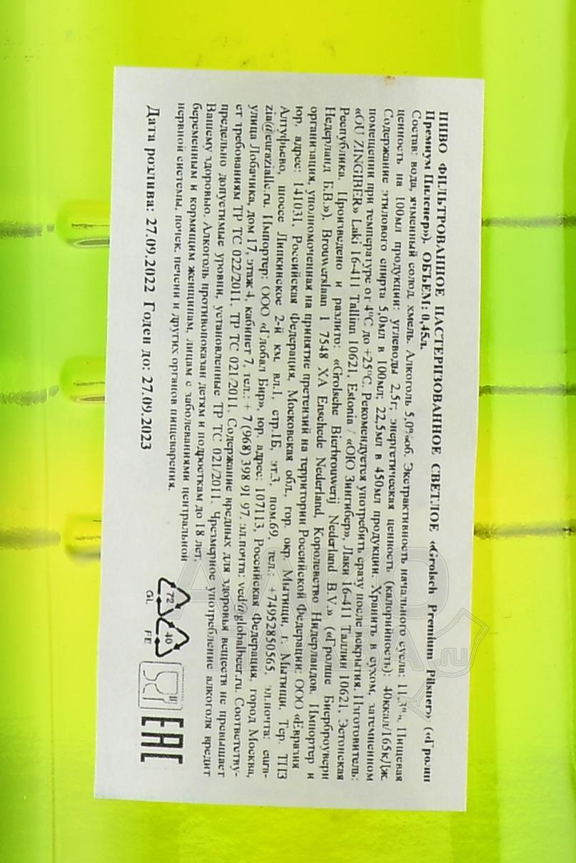 Пиво Grolsch Premium Lager светлое пастеризованное 0,45 л – лагер в стиле чешского пилснера. Напиток изготовлен из традиционных ингредиентов – ячменного солода, дрожжей, воды и хмеля – методом низового брожения. После первичной ферментации спиртное дображивается в лагерных танках на протяжении 10 недель. Два сорта хмеля придают вариации приятный аромат и свежий, но мягкий вкус.