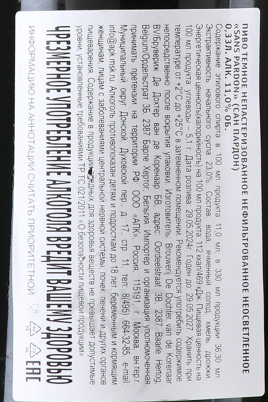 Пиво Sans Pardon 0,33 л темное нефильтрованное производят на территории региона Восточная Фландрия в Бельгии, известного своим умеренным климатом, мягкой влажной погодой и плодородными почвами, которые идеально подходят для выращивания высококачественного ячменя и хмеля. Напиток получают по сложной технологии двойной ферментации, завершающейся выдержкой в дубовых бочках, которые ранее использовались для крепких спиртных напитков. Пиво подвергается естественной карбонизации в бутылках, благодаря чему сохраняет все тонкости вкусовых оттенков.
