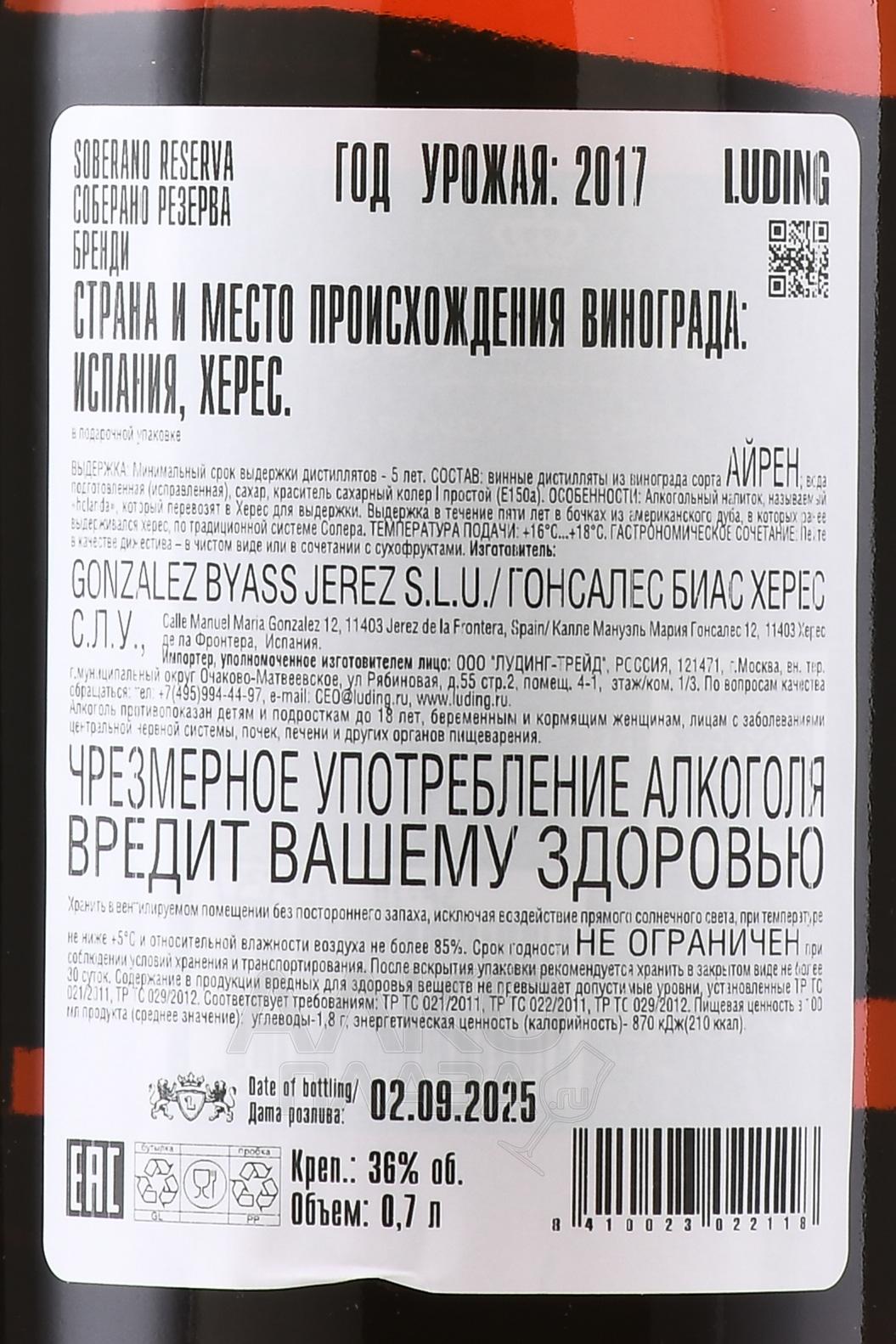 Бренди ди херес Soberano Reserva 5 лет 0,7 л — испанский напиток из региона Херес, который выпускает известный производитель Gonzalez Byass. Применяется традиционная технология «Criaderas y Solera». Напиток проходит выдержку минимум пять лет в американских дубовых бочках из-под хереса. Эта особенность придает ему насыщенный характер с выраженной дубовой ноткой. Благодаря высокому качеству, хересный бренди регулярно завоёвывает медали на престижных международных конкурсах и входит в рейтинги лучших испанских спиртных напитков.