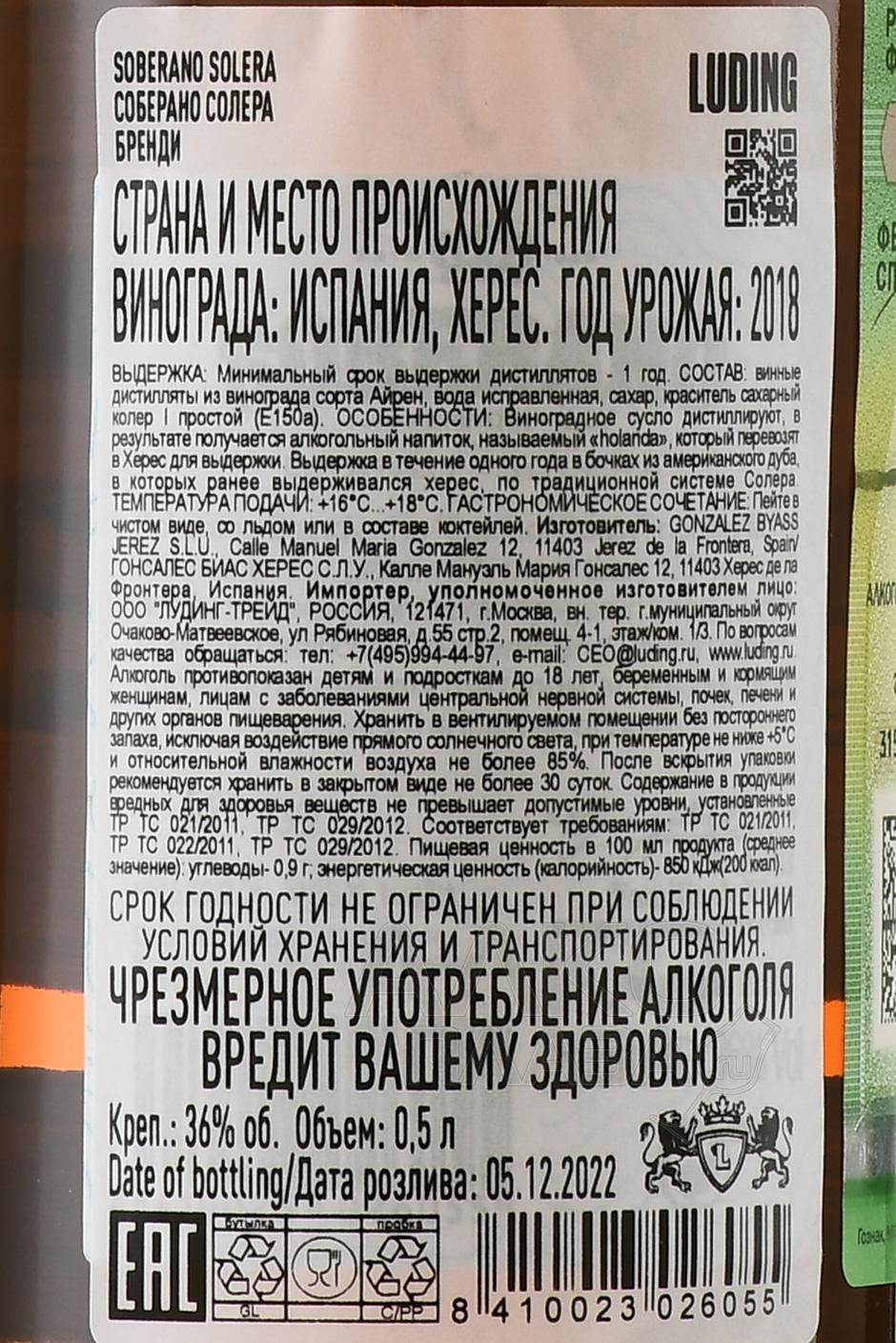 Бренди ди херес Soberano Solera 0,5 л — классический испанский алкоголь с элегантным стилем. Производится компанией Gonzalez Byass в регионе Херес-де-ла-Фронтера. Напиток получают из винограда сорта Айрен, выращенного в Ла-Манче. Для дистилляции используется традиционная колонная перегонка, отбирается «сердце», то есть центральная, максимально чистая фракция. Выдержка бренди проходит по методу солера в дубовых бочках из-под хереса, что придаёт особую глубину и мягкость вкусу. Соберано Солера получил титул «Лучший в своем классе» на International Wine & Spirit Competition, медали на ISC и рейтинг около 87 баллов на Distiller