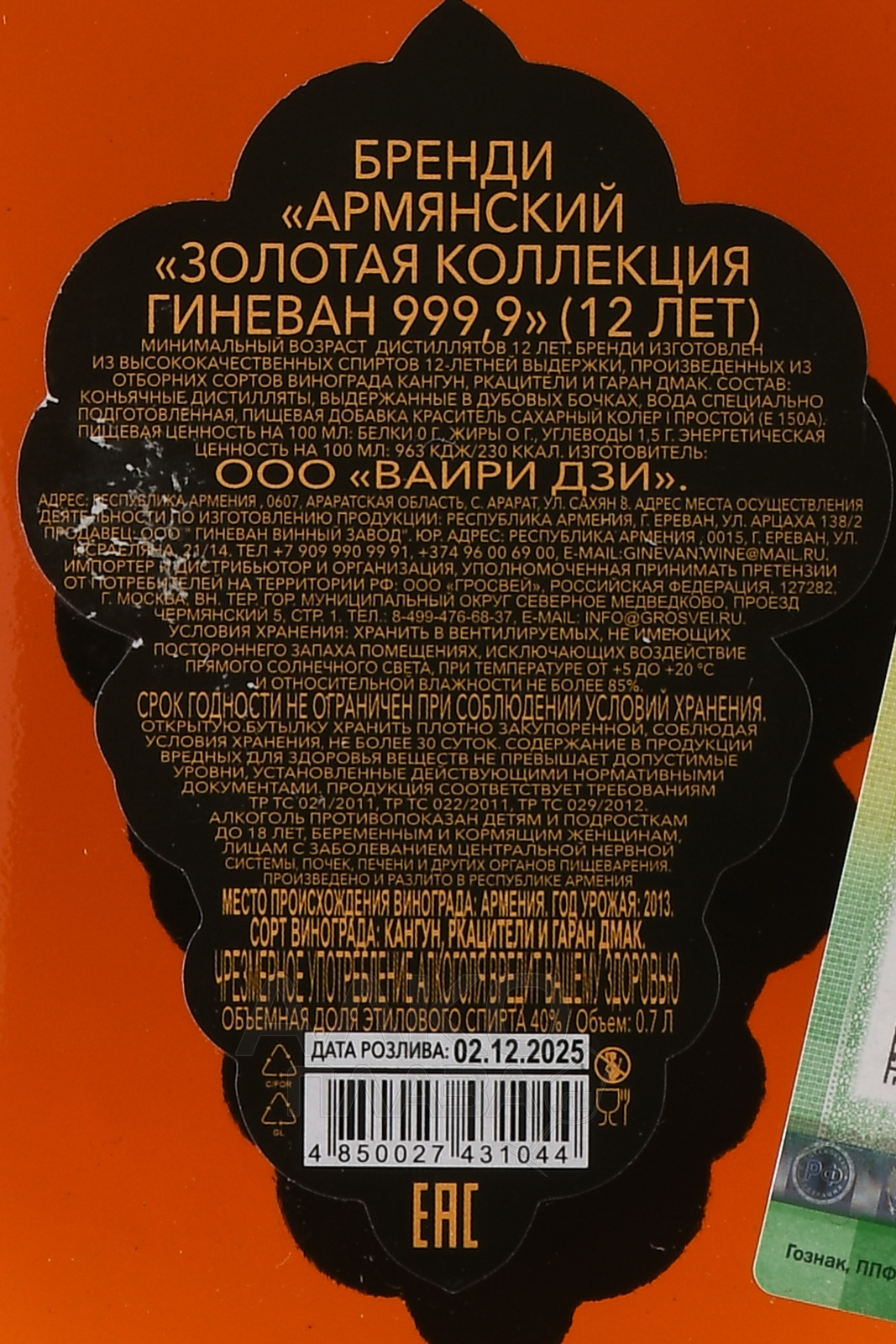 Бренди Гиневан Золотая Коллекция 999.9 12 лет 0.7 л в п/у