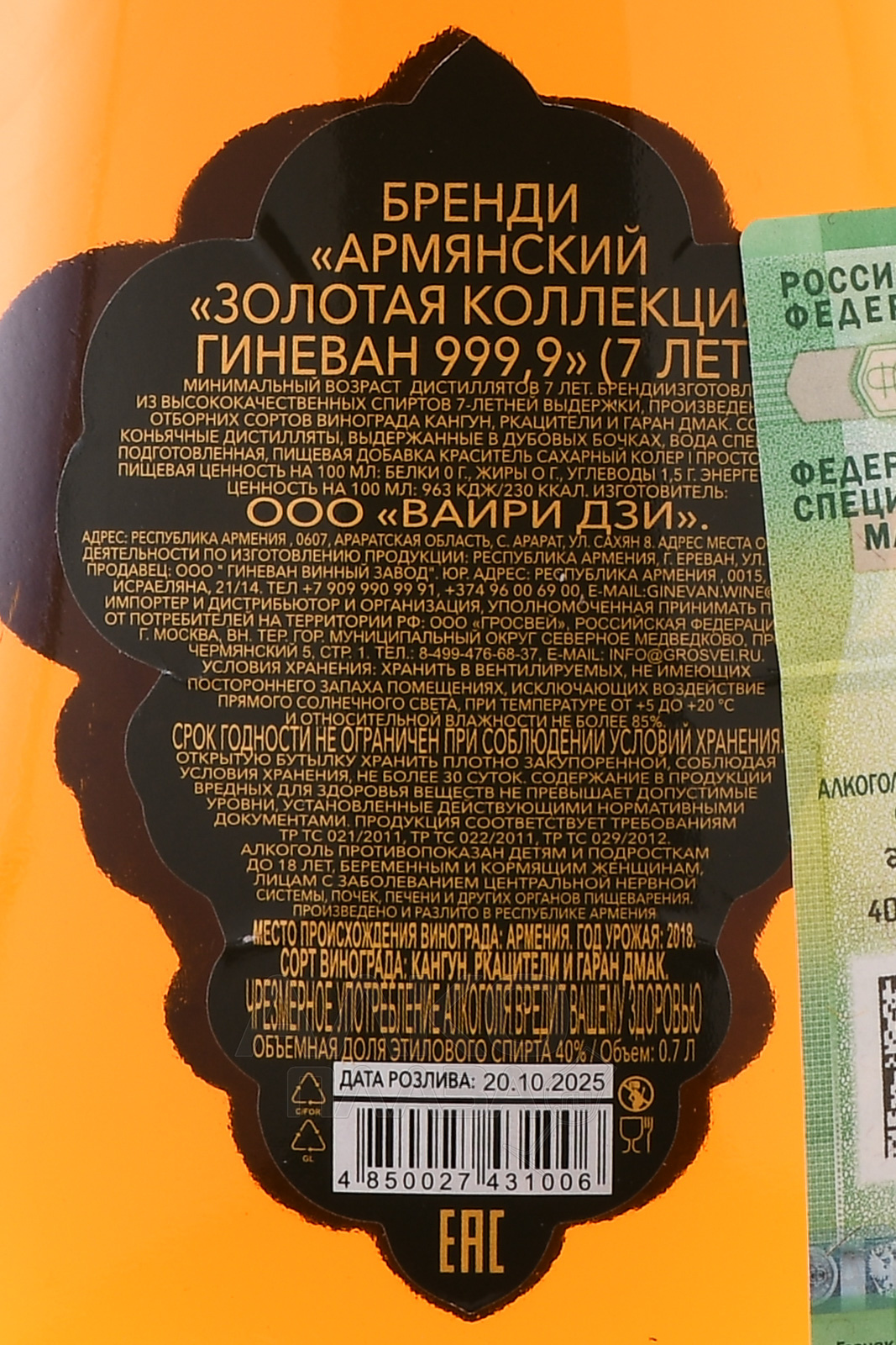 Бренди Гиневан Золотая Коллекция 999.9 7 лет 0.7л в п/у