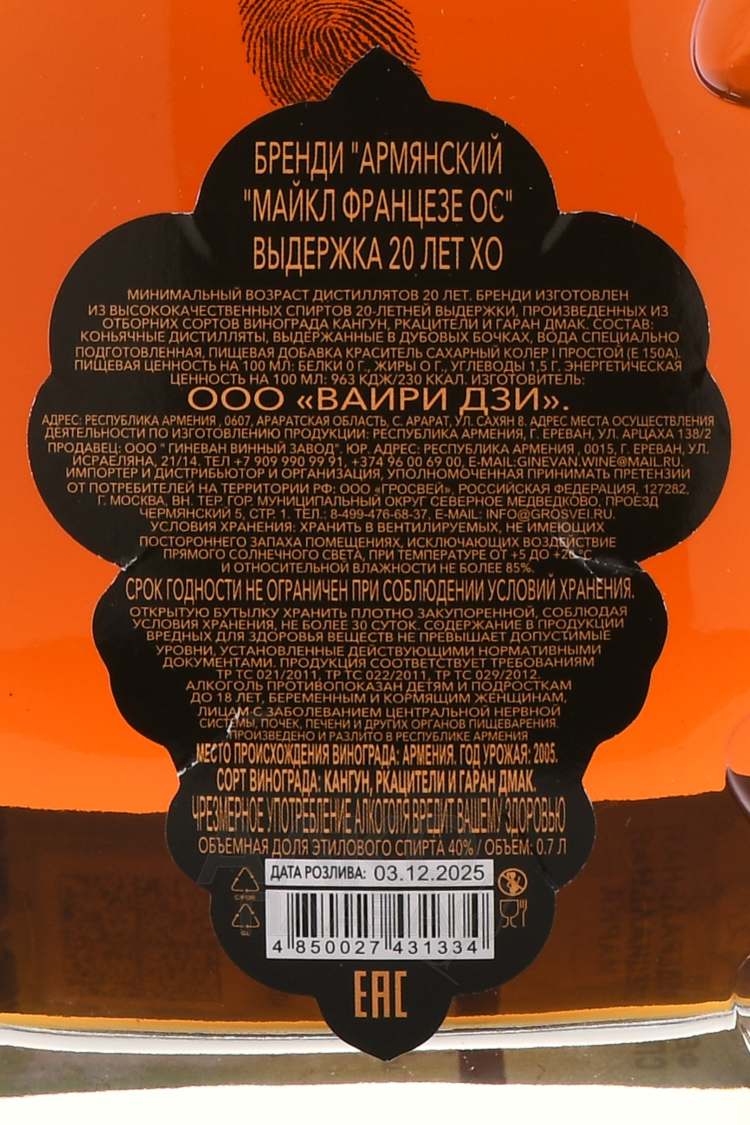 Бренди Майкл Францезе ХО 20 лет 0.7 л в п/у