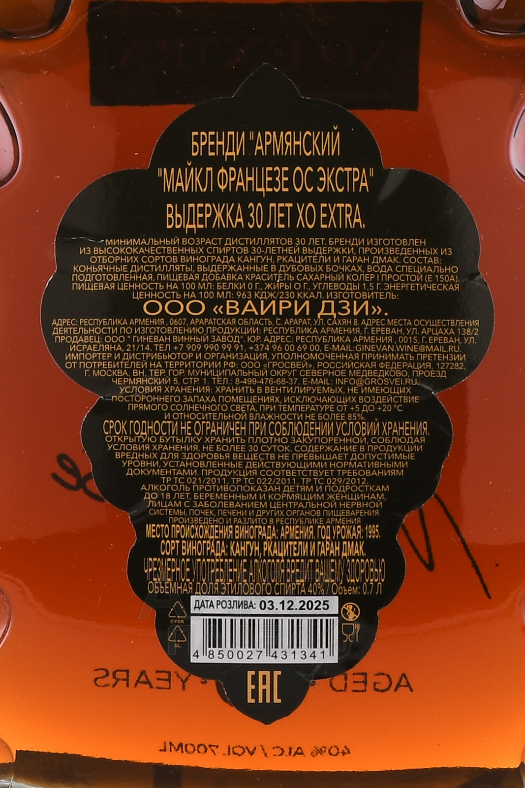 Бренди Майкл Францезе ХО Экстра 30 лет 0.7 л в п/у
