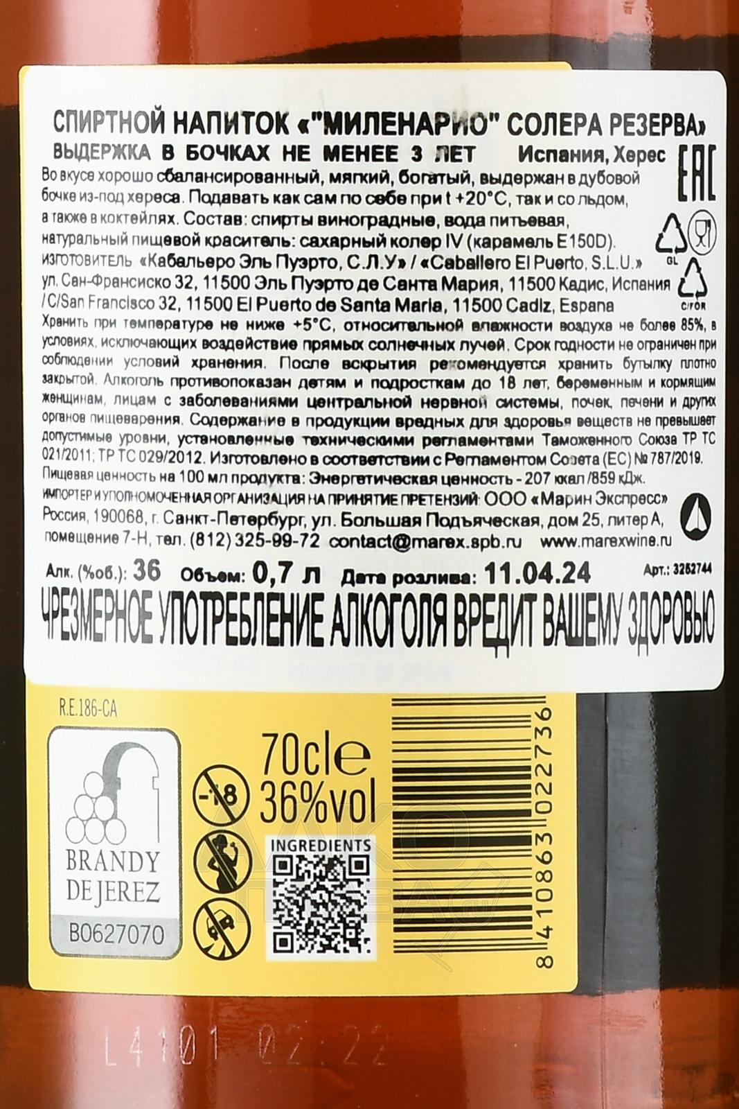 Бренди ди херес Milenario Solera Reserva 0,7 л в п/у — роскошный подарок для ценителя. Знаменитый алкоголь из испанской Андалусии не имеет аналогов в мире. Он представляет собой виноградный бренди, выдержанный по системе солера и криадера в хересных бочках. Общий срок созревания дистиллята — не менее 3 лет. Процесс купажирования разновозрастных спиртов происходит постепенно, поэтому хересный бренди обладает богатым и многогранным букетом.