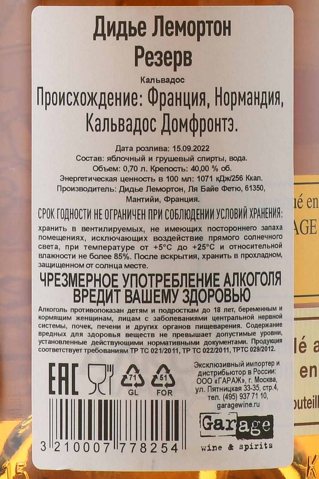 Выдержанный не менее 5 лет, кальвадос из региона Домфронте и изготавливаемый из яблочного и грушевого дистиллята. В аромате напитка переплетаются ноты свежих яблок и груш. Вкус кальвадоса выраженный, обладает богатой текстурой, а также цветочным послевкусием.