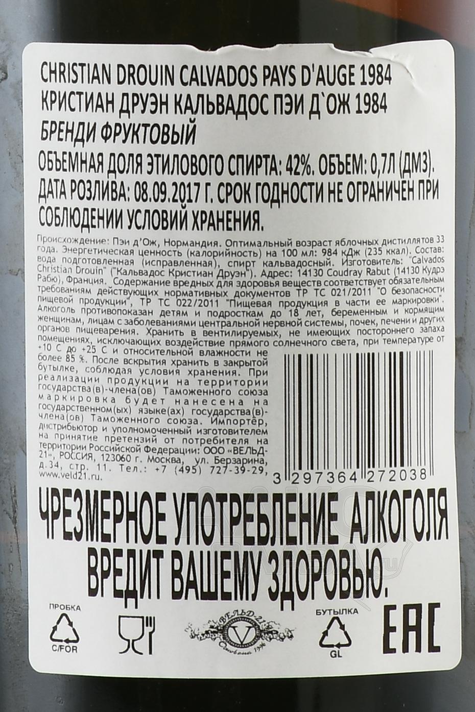 Кальвадос Christian Drouin Calvados Pays d’Auge 1984 г. 0,7 л в д/у – винтажная вариация от именитого французского дома с громким именем. Она создана классическим способом сбраживания и дистилляции свежего сырья с использованием многолетнего и наработок семейной компании Друэн. На производство купажа пошли яблоки четырех разновидностей – от горьких до сладких. Плоды собрали вручную спелыми, уже упавшими на землю. После сортировки их измельчили, дали постоять и отправили под пресс. Отжатый сок прошел этапы брожения и двукратной перегонки в медном кубе, а затем созревал в дубе, финишировав в бочках из-под натурального сладкого крепленого вина Banyuls родом из региона Руссильон.